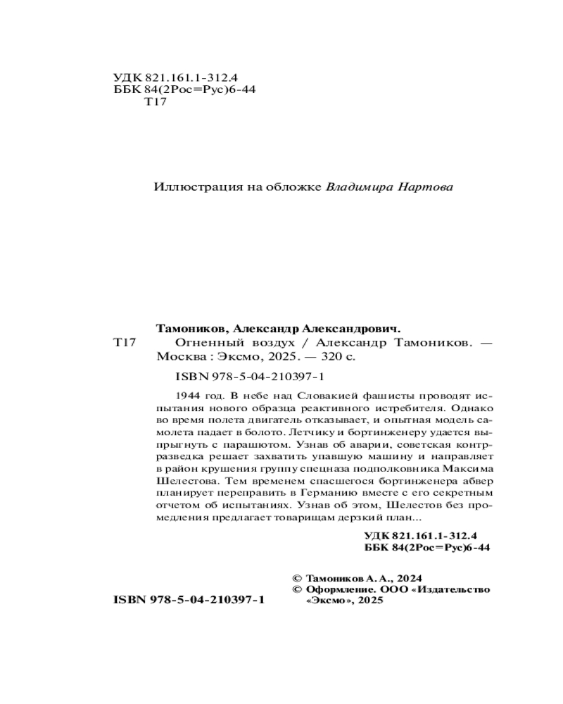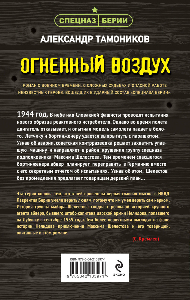 Огненный воздухАлександр Александрович Тамоников В данный момент этот товар отсутствует в продаже. Возможно, у нас найдется аналогичный или похожий товар здесь. Серия: Спецназ Берии. Герои секретной войны 1944 год. В небе над Словакией фашисты проводят испытания нового образца реактивного истребителя. Однако во время полета двигатель отказывает, и опытная модель самолета падает в болото. Летчику и бортинженеру удается выпрыгнуть с парашютом. Узнав об аварии, советская контрразведка решает захватить упавшую машину и направляет в район крушения группу спецназа подполковника Максима Шелестова. Тем временем спасшегося бортинженера абвер планирует переправить в Германию вместе с его секретным отчетом об испытаниях. Узнав об этом, Шелестов без промедления предлагает товарищам дерзкий план... |