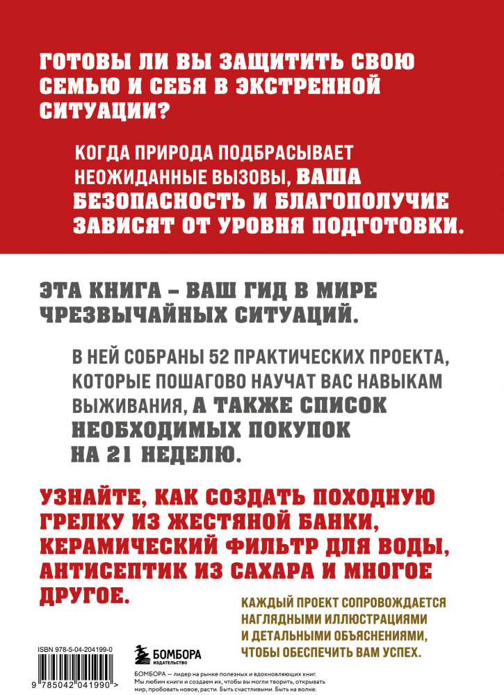 💳 Оплатить за товар можно при получении 🇰🇿 Есть бесплатная доставка по Казахстану от 1 дня 🎁 Копите бонусы с каждой покупки Серия: Искусство выживания Готовы ли вы защитить свою семью и себя в экстренной ситуации? Когда природа подбрасывает неожиданные вызовы, ваша безопасность и благополучие зависят от уровня подготовки. Эта книга — ваш гид в мире чрезвычайных ситуаций. В ней собраны 52 практических проекта, которые пошагово научат вас навыкам выживания, а также список необходимых покупок на 21 неделю. Узнайте, как создать походную грелку из жестяной банки, керамический фильтр для воды, антисептик из сахара и многое другое. Каждый проект сопровождается наглядными иллюстрациями и детальными объяснениями, чтобы обеспечить вам успех. |