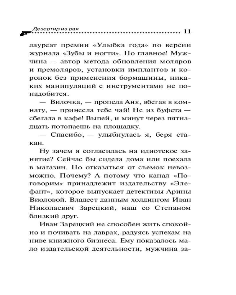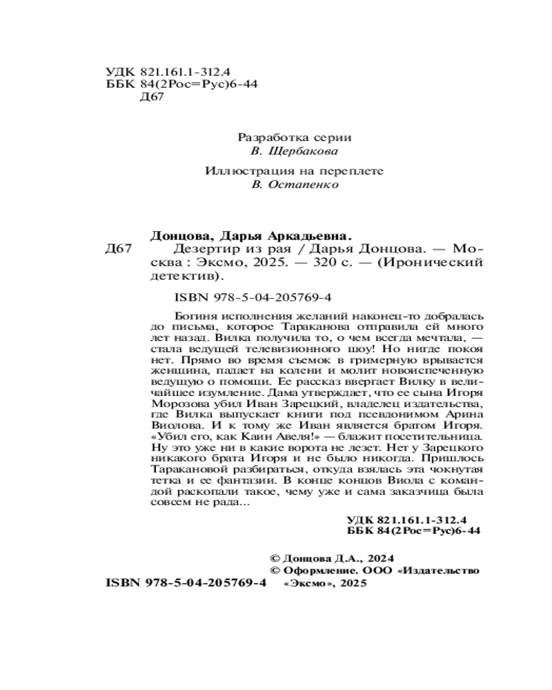 💳 Оплатить за товар можно при получении 🇰🇿 Есть бесплатная доставка по Казахстану от 1 дня 🎁 Копите бонусы с каждой покупки Серия: Иронический детектив Богиня исполнения желаний наконец-то добралась до письма, которое Тараканова отправила ей много лет назад. Вилка получила то, о чем всегда мечтала — стала ведущей телевизионного шоу! Но нигде покоя нет. Прямо во время съемок в гримерную врывается женщина, падает на колени и молит новоиспеченную ведущую о помощи. Ее рассказ ввергает Вилку в величайшее изумление. Дама утверждает, что ее сына Игоря Морозова убил Иван Зарецкий, владелец издательства, где Вилка выпускает книги под псевдонимом Арина Виолова. И к тому же Иван является братом Игоря. «Убил его, как Каин Авеля!» — блажит посетительница. Ну это уже ни в какие ворота не лезет. Нет у Зарецкого никакого брата Игоря, и не было никогда. Пришлось Таракановой разбираться, откуда взялась эта чокнутая тетка и ее фантазии. В конце концов Виола с командой раскопали такое, чему уже и сама заказчица была совсем не рада... |