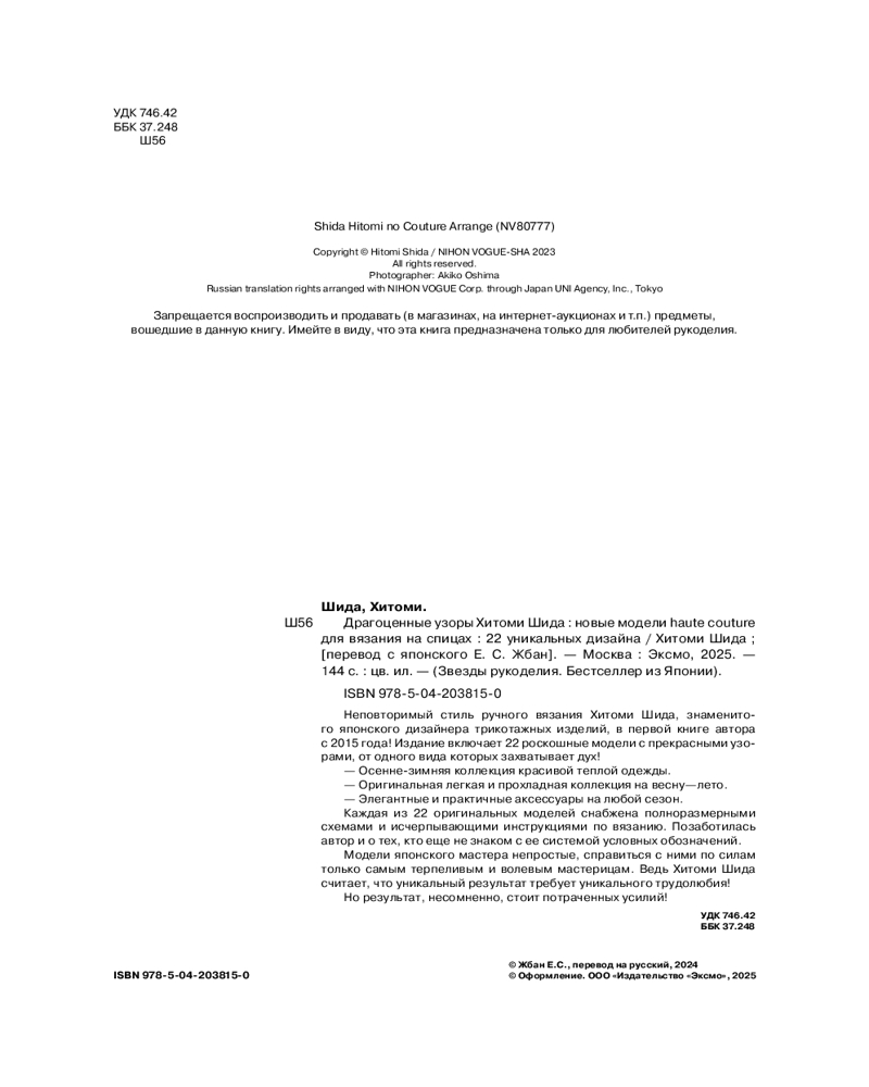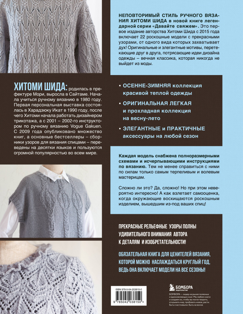 💳 Оплатить за товар можно при получении 🇰🇿 Есть бесплатная доставка по Казахстану от 1 дня 🎁 Копите бонусы с каждой покупки Серия: Звезды рукоделия. Бестселлер из Японии Ни одному вяжущему человеку в нашей стране не надо объяснять, кто такая Хитоми Шида. Авторские узоры самого знаменитого японского мастера — настоящие драгоценности, а оригинальные модели — вечная классика, которая никогда не выйдет из моды! Оригинальные и элегантные мотивы, перетекающие друг в друга, потрясающие идеи дизайна одежды — в совершенно новой книге, первой авторской коллекции моделей с 2015 года! Прекрасные рельефные узоры полны удивительного внимания автора к деталям и изобретательности! А модели отличаются изысканностью и истинно японским лаконичным стилем, который уравновешивается тонкой «резьбой» изысканных мотивов. |