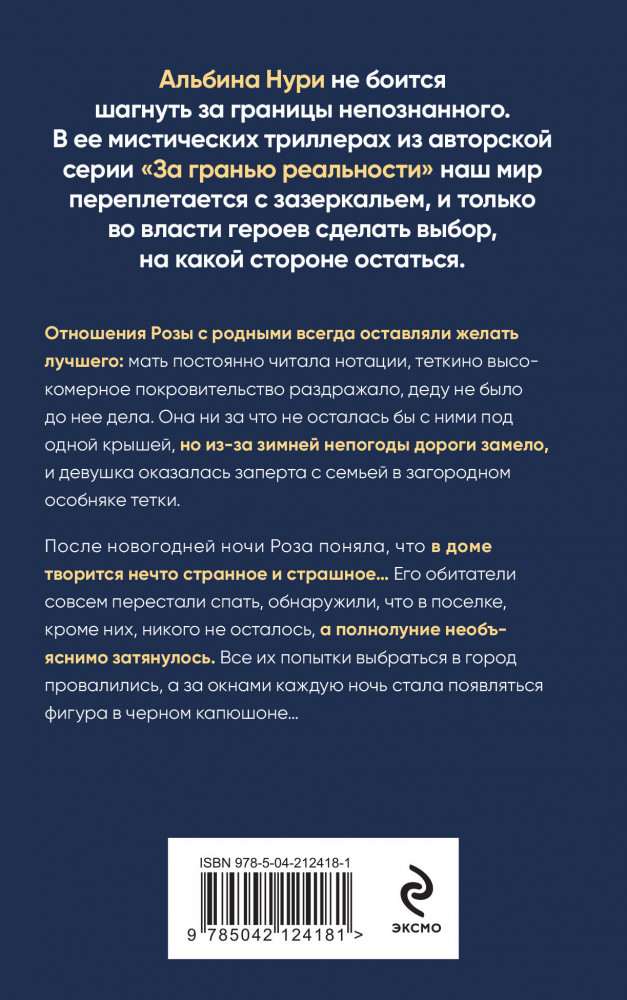 Пятый неспящийВ данный момент этот товар отсутствует в продаже. Возможно, у нас найдется аналогичный или похожий товар здесь. Серия: За гранью реальности. Мистические триллеры Альбины Нури (обложка) Отношения Розы с родными всегда оставляли желать лучшего: мать постоянно читала нотации, теткино высокомерное покровительство раздражало, деду не было до нее дела. Она ни за что не осталась бы с ними под одной крышей, но из-за зимней непогоды дороги замело, и девушка оказалась заперта с семьей в загородном особняке тетки. После новогодней ночи Роза поняла, что в доме творится нечто странное и страшное... Его обитатели совсем перестали спать, обнаружили, что в поселке, кроме них, никого не осталось, а полнолуние необъяснимо затянулось. Все их попытки выбраться в город провалились, а за окнами каждую ночь стала появляться фигура в черном капюшоне... |