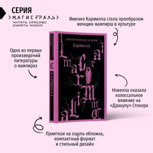 Дракула. Кармилла. Комплект из 2 книгБрэм Стокер, Джозеф Шеридан Ле Фаню В данный момент этот товар отсутствует в продаже. Возможно, у нас найдется аналогичный или похожий товар здесь. Серия: Магистраль. Главный тренд «Кармилла» — готическая новелла 1872 года ирландского писателя Джозефа Шеридана Ле Фаню и одно из первых произведений литературы о вампирах, написанная на четверть века раньше «Дракулы» Брэма Стокера (1897). В изолированном от внешнего мира замке, глубоко в австрийских лесах Штирии, Лора ведет уединенную жизнь со своим отцом и немногочисленными слугами. Однажды лунной ночью в поле разбивается карета, везущая нежданного гостя — красавицу Кармиллу. Лора и отец приглашают ее остаться у них, пока она не поправится. Прекрасная незнакомка принимает предложение. Вскоре начинают происходить странные события: Лора заболевает, ее состояние ухудшается с каждым днем, а по ночам мучают приступы удушья. После нескольких мучительных ночей юной Лоре предстоит узнать шокирующую правду о загадочной гостье. |