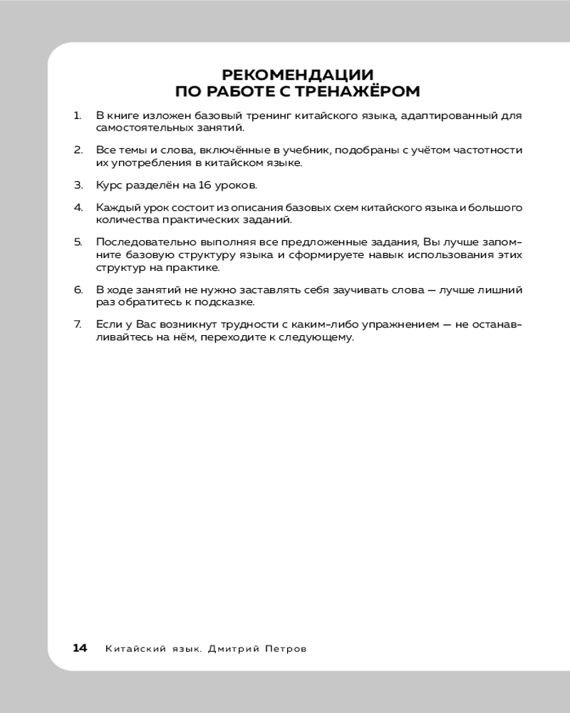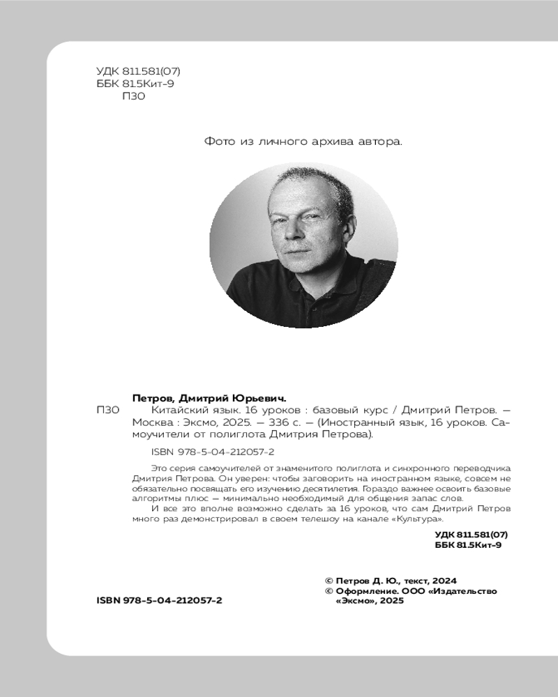 💳 Оплатить за товар можно при получении 🇰🇿 Есть бесплатная доставка по Казахстану от 1 дня 🎁 Копите бонусы с каждой покупки Серия: Иностранный язык, 16 уроков. Самоучители от полиглота Дмитрия Петрова Это серия самоучителей от знаменитого полиглота и синхронного переводчика Дмитрия Петрова. Он уверен: чтобы заговорить на иностранном языке, совсем не обязательно посвящать его изучению десятилетия. Гораздо важнее освоить базовые алгоритмы, плюс — минимально необходимый для общения запас слов. И все это вполне возможно сделать за 16 уроков, что сам Дмитрий Петров много раз демонстрировал в своем телешоу на канале «Культура». У тех, кто знает китайский, больше карьерных и финансовых перспектив, а выучить его не сложнее, чем английский. Так считает автор этого самоучителя Дмитрий Петров и предлагает компактную систему освоения начального уровня. |