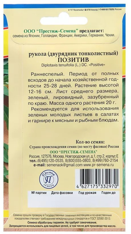 💳 Оплатить за товар можно при получении 🇰🇿 Есть бесплатная доставка по Казахстану от 1 дня 🎁 Копите бонусы с каждой покупки Рукола «Позитив» — раннеспелый сорт дикой руколы, характеризующийся высокой продуктивностью, неприхотливостью и способностью расти как в открытом, так и в закрытом грунте. Хорошо переносит транспортировку, надолго сохраняя товарный внешний вид. Обладает приятным горчично-оливковым вкусом и выраженным ароматом. Рукола Позитив: особенности выращивания Рукола светолюбива, для посадки рекомендуется выбирать хорошо освещенные участки с нейтральной или слабо-кислой почвой. Растение требовательно к влажности, ему нужен регулярный полив, а в периоды засухи — еще более частый. Для получения обильного урожая посев руколы можно производить несколько раз за сезон, а в зимний период выращивать на подоконнике |