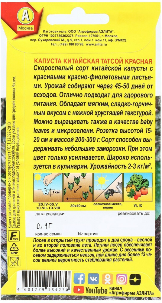 💳 Оплатить за товар можно при получении 🇰🇿 Есть бесплатная доставка по Казахстану от 1 дня 🎁 Копите бонусы с каждой покупки Серия: Диковинные овощи Скороспелый сорт китайской капусты с красивыми красно-фиолетовыми листьями. Урожай собирают через 45-50 дней от всходов. Отлично подходит для здорового питания. Обладает мягким, сладко-горчичным вкусом с нежной хрустящей текстурой. Можно выращивать также в качестве baby leaves и микрозелени. Розетка высотой 15-20 см и массой 200-300 г. Сорт способен выдерживать небольшие заморозки. При этом цвет только усиливается. Широко используется в кулинарии. Урожайность 2-3 кг/м2. |
