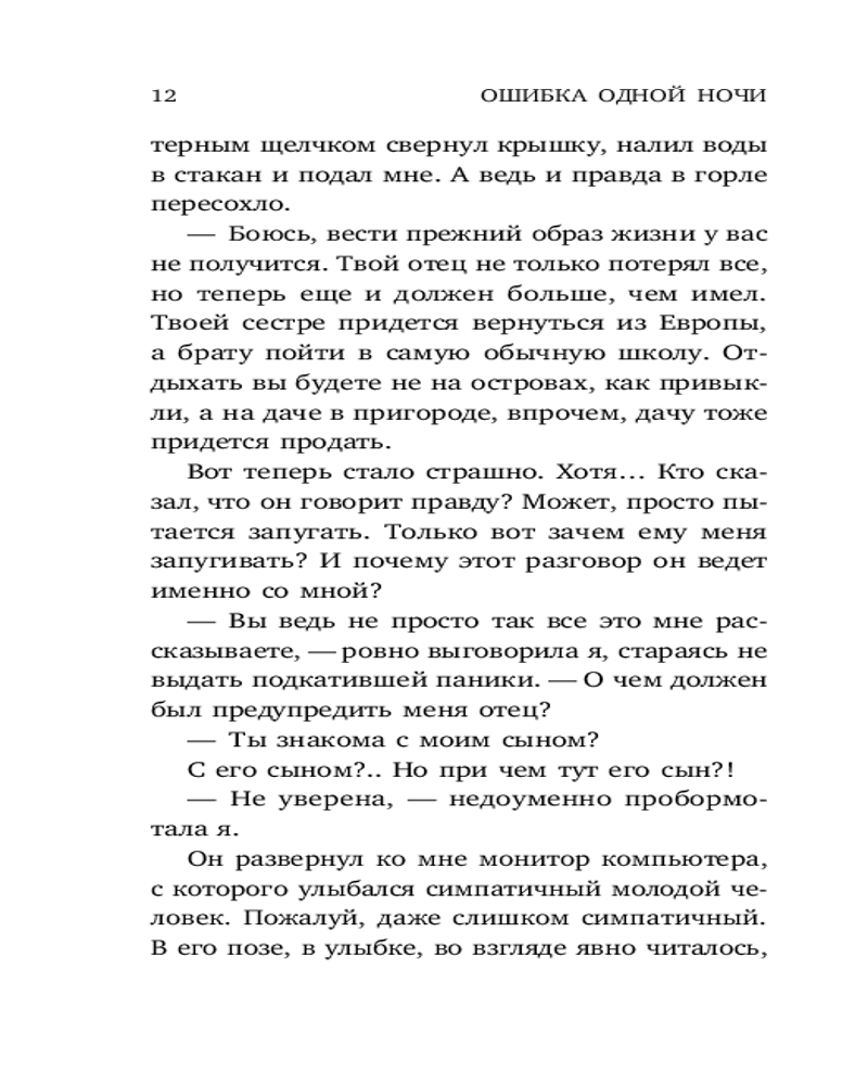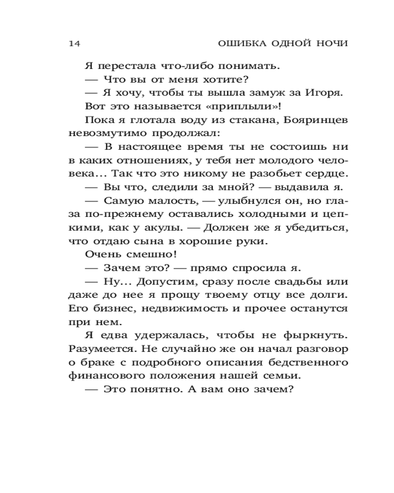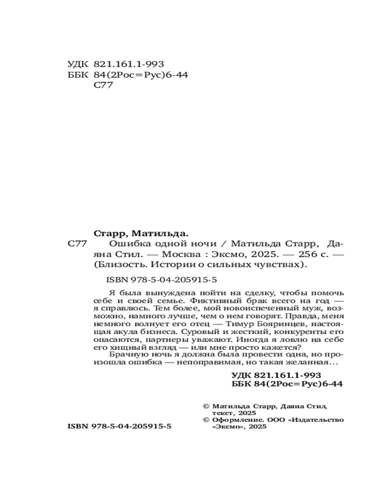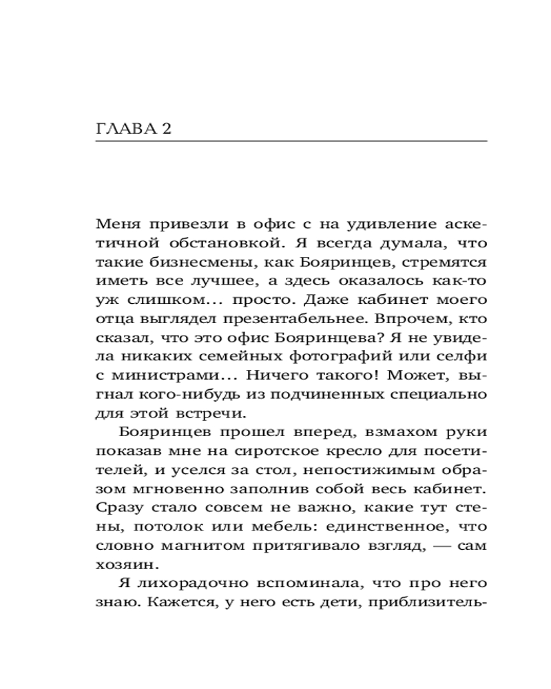 💳 Оплатить за товар можно при получении 🇰🇿 Есть бесплатная доставка по Казахстану от 1 дня 🎁 Копите бонусы с каждой покупки Серия: Близость. Истории о сильных чувствах Ульяна, дочь богатого бизнесмена, наслаждалась жизнью, пока в один день всё не рухнуло. Отец разорен и задолжал огромную сумму олигарху Тимуру Бояринцеву. Тот предлагает неожиданную сделку — Ульяна должна выйти замуж за его сына Игоря, тогда ее отцу простят долг. Выходки взбалмошного наследника смутили бизнес-партнеров Бояринцева, женитьба могла бы помочь восстановить его репутацию. |