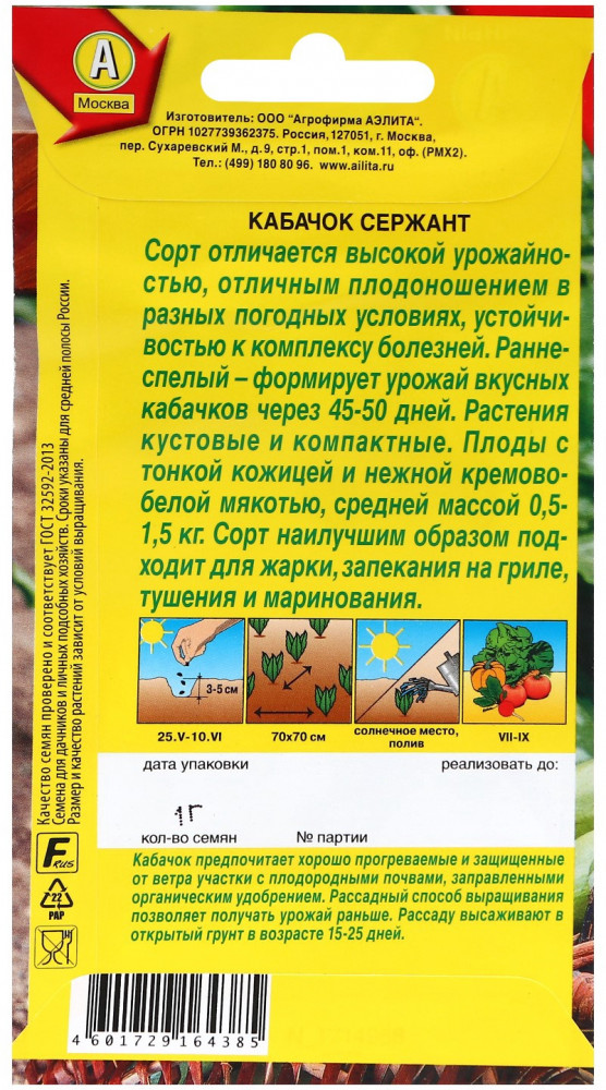 Аэлита Семена кабачков цукини «Сержант»В данный момент этот товар отсутствует в продаже. Возможно, у нас найдется аналогичный или похожий товар здесь. Серия: Удачный урожай Сорт отличается высокой урожайностью, отличным плодоношением в разных погодных условиях, устойчивостью к комплексу болезней. Раннеспелый — формирует урожай вкусных кабачков через 45-50 дней. Растения кустовые и компактные. Плоды с тонкой кожицей и нежной кремово-белой мякотью, средней массой 0.5-1.5 кг. Сорт наилучшим образом подходит для жарки, запекания на гриле, тушения и маринования. |
