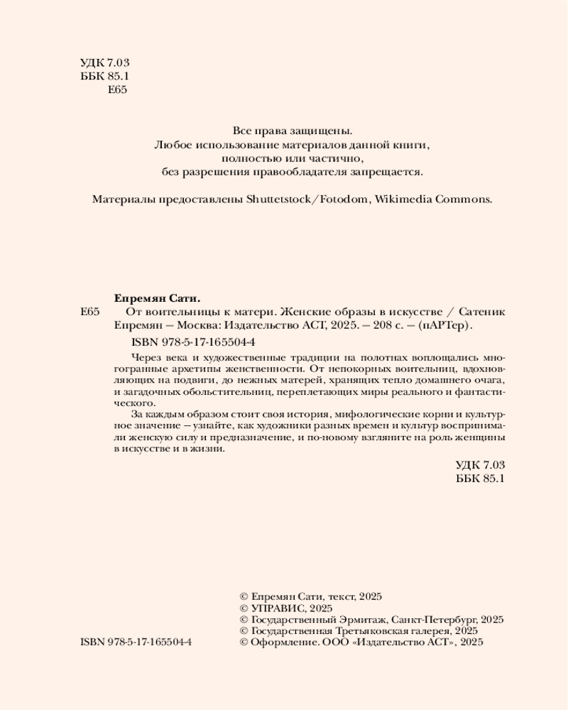 💳 Оплатить за товар можно при получении 🇰🇿 Есть бесплатная доставка по Казахстану от 1 дня 🎁 Копите бонусы с каждой покупки Серия: пАРТер Через века и художественные традиции на полотнах воплощались многогранные архетипы женственности. От непокорных воительниц, вдохновляющих на подвиги, до нежных матерей, хранящих тепло домашнего очага, и томных обольстительниц, чарующих разум и душу. За каждым образом стоит своя история, мифологические корни и культурное значение — узнайте, как художники разных времен и культур воспринимали и интерпретировали женскую силу и предназначение, и по-новому взгляните на роль женщины в искусстве и в жизни. Сати Епремян — искусствовед, специалист по психологии искусства, психолог, арт-консультант по покупке и продаже произведений искусства. |