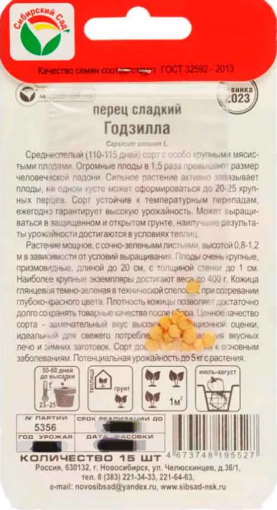 Сибирский Сад Семена перца сладкого «Годзилла»В данный момент этот товар отсутствует в продаже. Возможно, у нас найдется аналогичный или похожий товар здесь. Среднеспелый (110-115 дней) сорт с особо крупными мясистыми плодами. Огромные плоды в 1,5 раза превышают размер человеческой ладони. Сильное растение активно завязывает плоды, на одном кусту может сформироваться до 20-25 крупных перцев. Сорт устойчив к температурным перепадам, ежегодно гарантирует высокую урожайность. Может выращиваться в защищенном и открытом грунте, наилучшие результаты урожайности достигаются в условиях теплиц. |