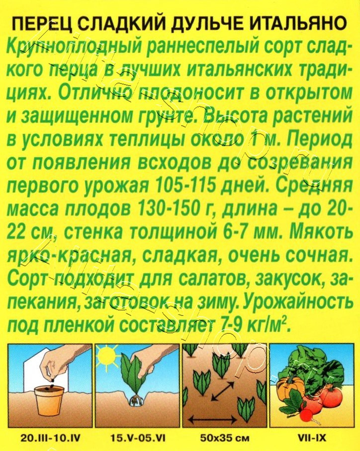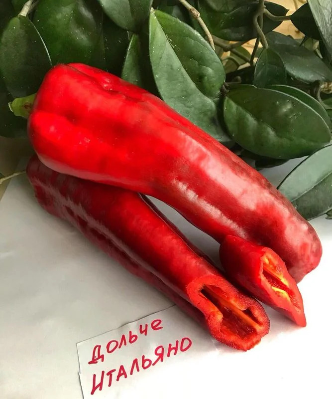 Крупноплодный раннеспелый сорт сладкого перца в лучших итальянских традициях. Отлично плодоносит в открытом и защищенном грунте. Высота растений в условиях теплицы около 1 м. Период от появления всходов до созревания первого урожая 105-115 дней. Средняя масса плодов 130-150 г, длина — до 20- 22 см, стенка толщиной 6-7 мм. Мякоть ярко-красная, сладкая, очень сочная. Сорт подходит для салатов, закусок, запекания, заготовок на зиму. Урожайность под пленкой составляет 7-9 кг/м2.