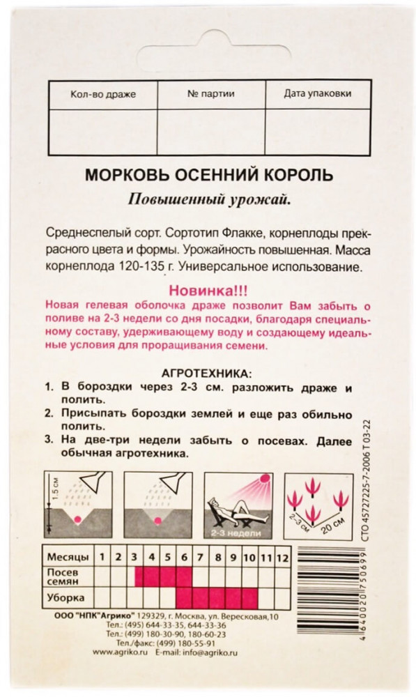 Агрико Семена моркови «Осенний Король»В данный момент этот товар отсутствует в продаже. Возможно, у нас найдется аналогичный или похожий товар здесь. Новинка! Новая гелевая оболочка драже позволит Вам забыть о поливе на 2-3 недели со дня посадки, благодаря специальному составу, удерживающему воду и создающему идеальные условия для проращивания семени. Повышенный урожай. Среднеспелый сорт. Сортотип Флакке, корнеплоды прекрасного цвета и формы. Урожайность повышенная. Масса корнеплода 120-135 г. Универсальное использование. |