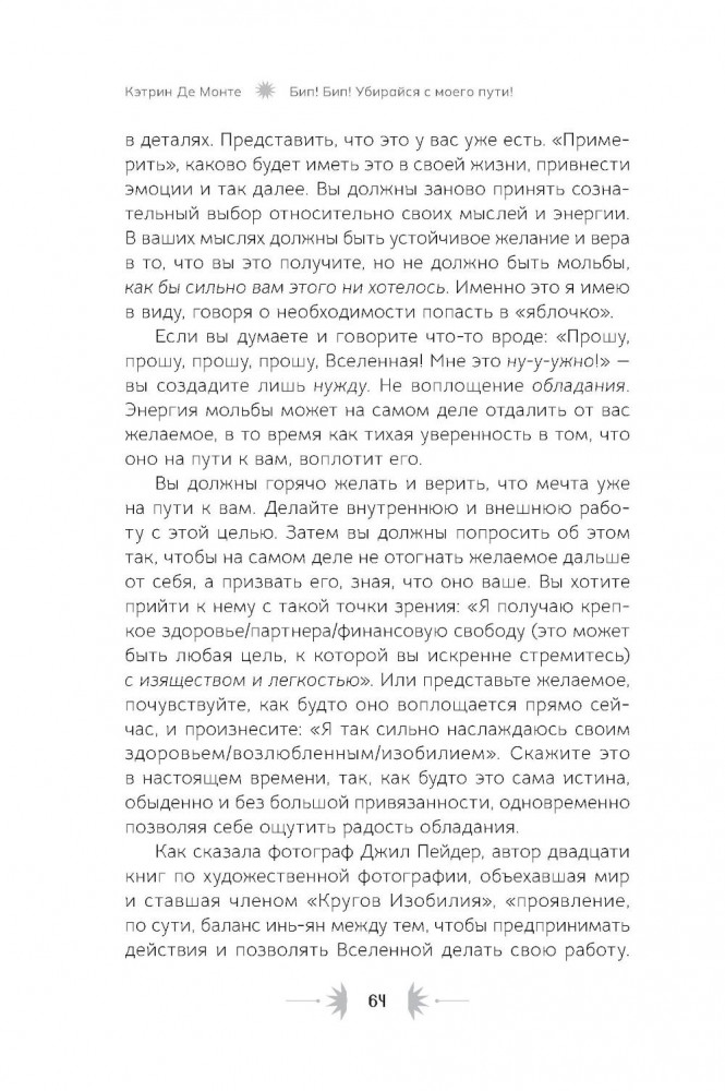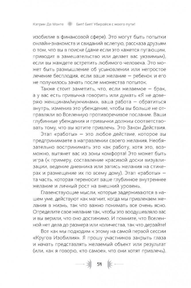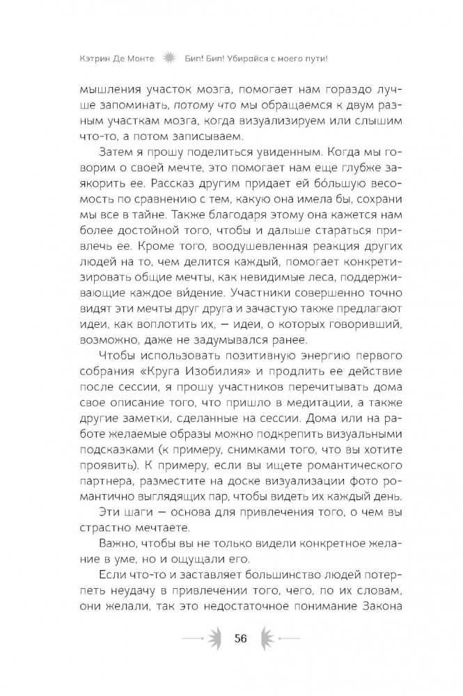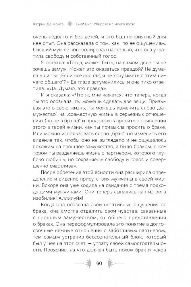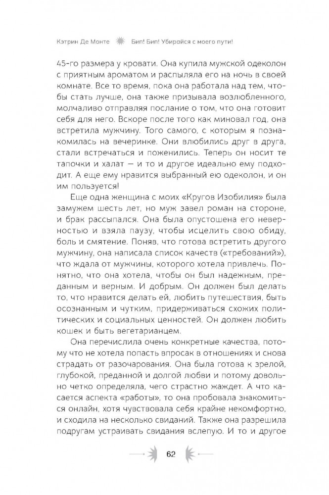 💳 Оплатить за товар можно при получении 🇰🇿 Есть бесплатная доставка по Казахстану от 1 дня 🎁 Копите бонусы с каждой покупки Автор: Де Монте К., «Бип! Бип! Убирайся с моего пути! Семь способов творить в полную силу и идти по жизни без остановок»: Практически каждый человек хочет встретить любящего партнёра, создать крепкую семью, обрести финансовую стабильность. Мечты, которые присущи всем людям, зачастую вызывают неуверенность в собственных силах, а как реагировать на самые смелые желания и амбициозные планы? Например, переехать в другую страну с незнакомой культурой и состояться там как профессионал. Или запустить успешный международный бизнес, или даже выиграть премию «Эмми»! Многие люди ответят, что это — бессмысленные фантазии. Клиенты Кэтрин Де Монте тоже так считали... пока всё это не воплотилось в их жизни. Но вот вопрос: почему же большие мечты зачастую не сбываются? Почему я могу найти идеальное место для машины в переполненном парке, но все еще жду, когда меня заметят, оценят мой талант? Причина может быть в скрытых преградах на пути к вашим целям. Для достижения желаемого недостаточно одних лишь визуализаций и аффирмаций. Кэтрин Де Монте знает это на собственном опыте: её «крупная мечта» долгое время оставалась недосягаемой. |