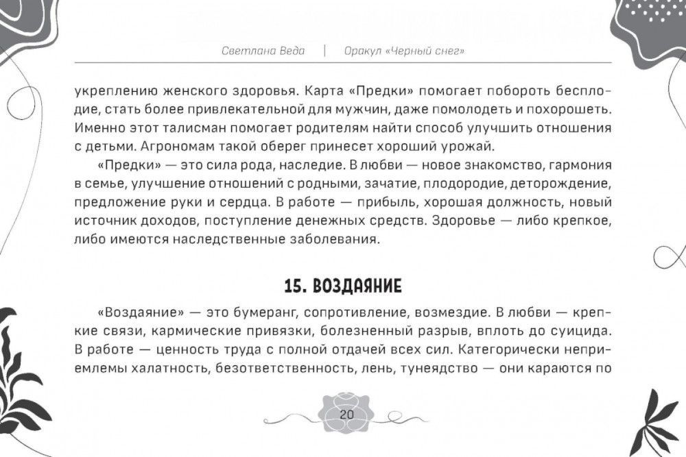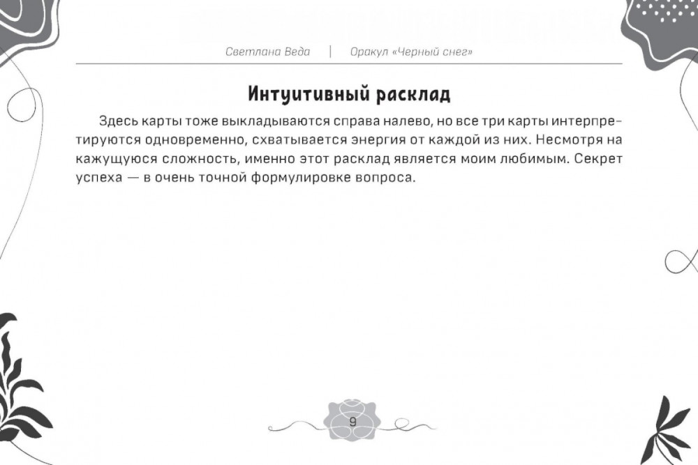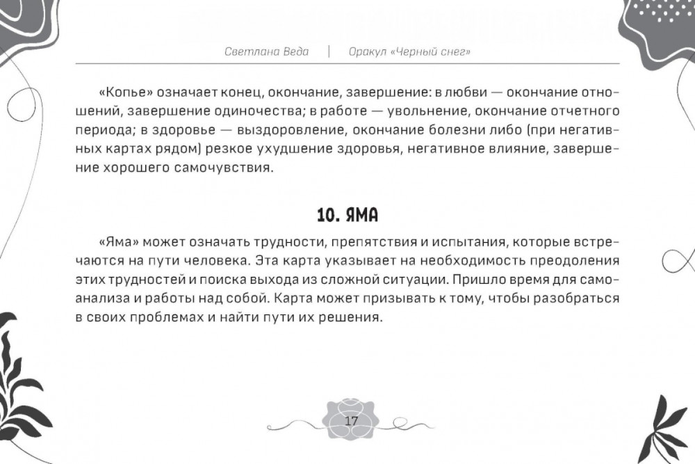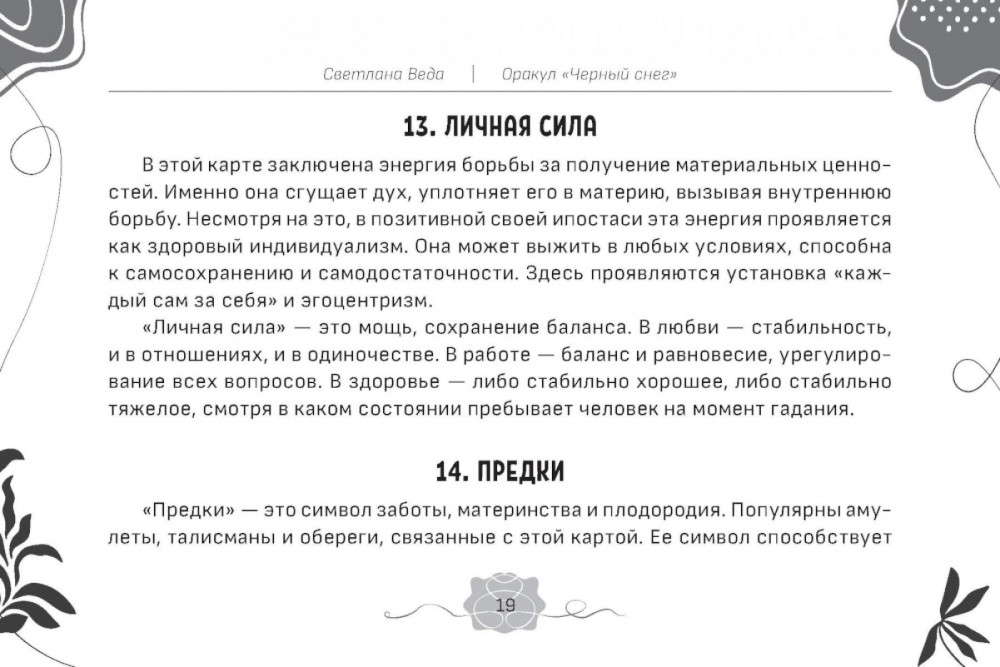 💳 Оплатить за товар можно при получении 🇰🇿 Есть бесплатная доставка по Казахстану 🎁 Копите бонусы с каждой покупки Название новой колоды Светланы Веды «Черный снег» символизирует единство противоположностей, тонкий баланс добра и зла. Оно говорит о том, что нет плохих людей — есть плохие поступки. Нет света без тьмы. Нет тени без света. Так и в оракуле сочетаются карты светлого и темного порядка, которые в равной степени дают подсказки и направляют, а также воздействуют на ситуацию. С их помощью вы сможете предсказывать и делать диагностику, очищать пространство, избавляться от врагов, привлекать деньги, любовь, удачу. Исполнять задуманные желания, видеть вещие сны, дарить близким счастье. «Черный снег» подходит для магического воздействия. В колоде есть карты с исцеляющим и защитным эффектом. Автор также подскажет, как обратить карты негативного порядка себе во благо. |