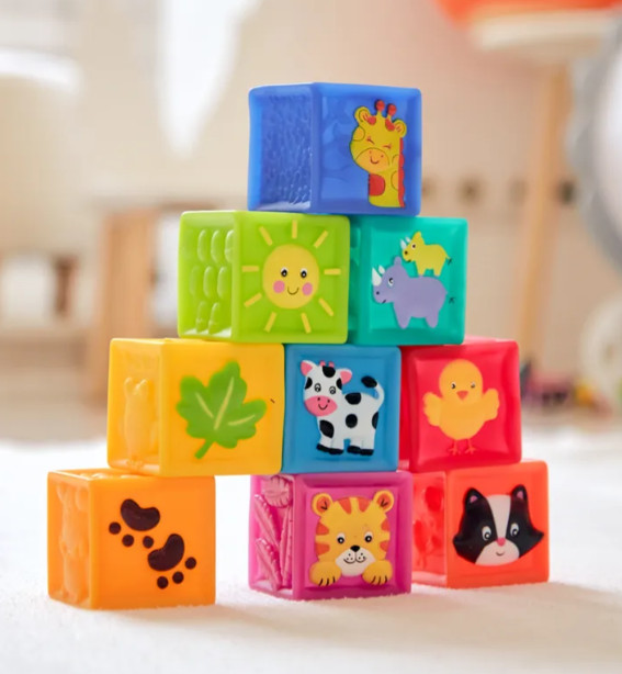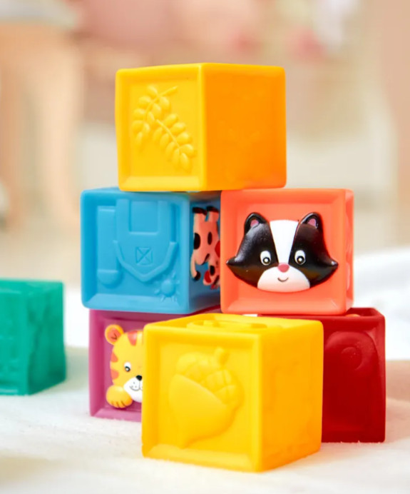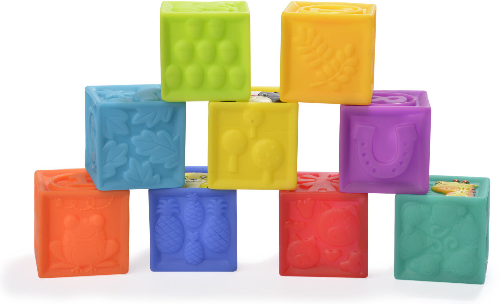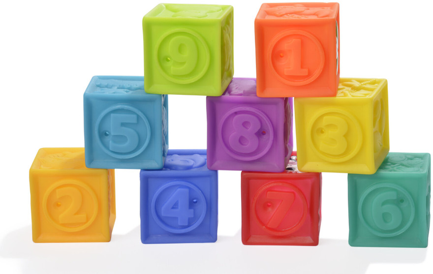 На сторонах кубиков нанесены рельефные изображения животных и птичек, растений, различных предметов и цифр от 1 до 9. А если нажать на кубик, то можно услышать забавный звук. Рельефные поверхности способствуют развитию мелкой моторики и тактильных ощущений. Кубики можно также использовать во время купания и использовать их как брызгалки. Превратите водные процедуры малыша в увлекательную игру!