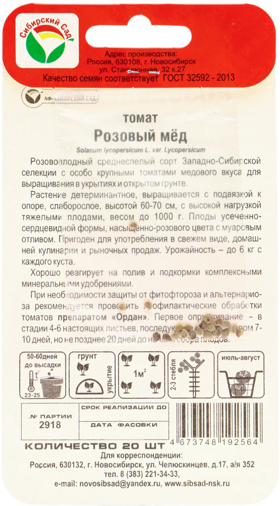 Сибирский Сад Семена томата «Розовый мед»сладкий вкус надежность любимость В данный момент этот товар отсутствует в продаже. Возможно, у нас найдется аналогичный или похожий товар здесь. Новый сорт Западно-Сибирской селекции с особо крупными плодами медового вкуса. Растение детерминантное, слаборослое, высотой 60-70 см, с высокой нагрузкой тяжелыми плодами, весом до 1500 г. Плоды усечено-сердцевидной формы, насыщенно-розового цвета с муаровым отливом. Пригоден для употребления в свежем виде, домашней кулинарии и рыночных продаж. Посев на рассаду производят за 50-60 дней до высадки растений на постоянное место. Оптимальная постоянная температура прорастания семян 23-25°С. При высадке в грунт на 1 кв. м размещают 3 растения. Сорт хорошо реагирует на полив и подкормки комплексными минеральными удобрениями. Выращивают в 2-3 стебля с подвязкой. |