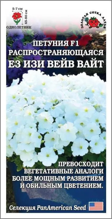 Золотая сотка Алтая Семена петунии «Е3 Изи Вейв Вайт F1»В данный момент этот товар отсутствует в продаже. Возможно, у нас найдется аналогичный или похожий товар здесь. Петунии серии «E3 Easy Wave» менее требовательны к длине светового дня, долго сохраняют привлекательность, цветут продолжительно и очень обильно, формируют плотные аккуратные и чрезвычайно компактные кустики. Цветы белоснежные, многочисленные, воронковидной формы. Разрастаясь, плети образуют сплошной ковер площадью до 1 м², а в подвесных кашпо и вазонах на ножке формируют красивую куполообразную крону. |