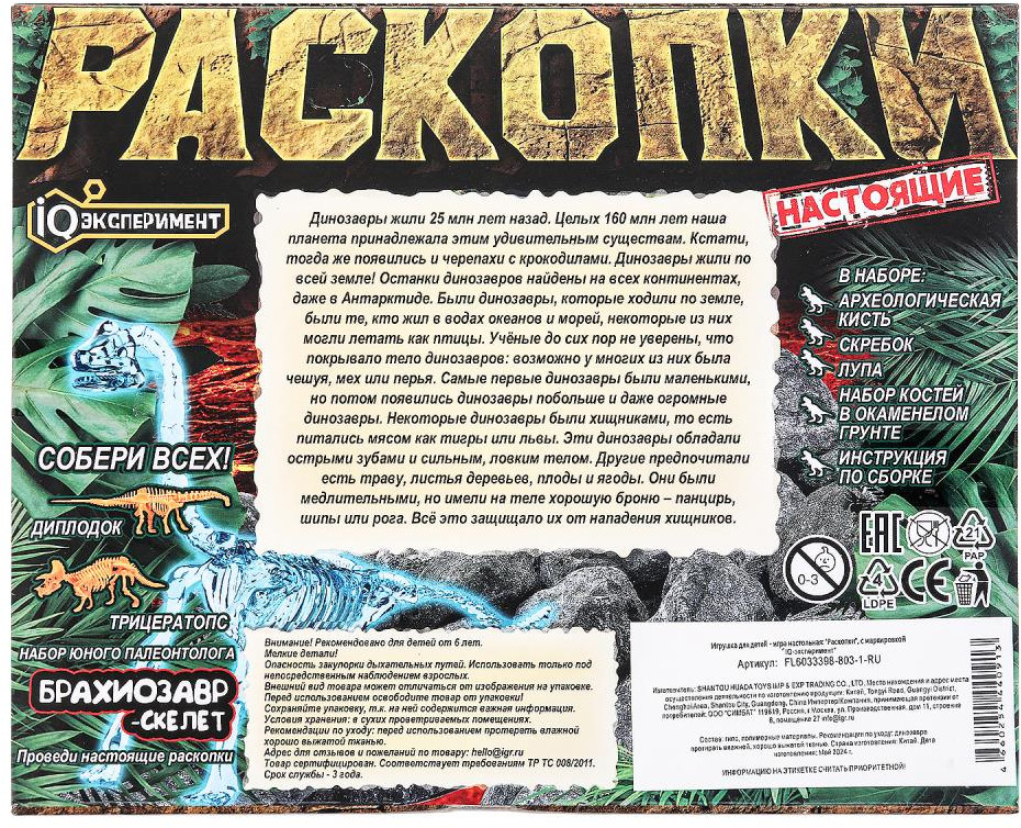 💳 Оплатить за товар можно при получении 🇰🇿 Есть бесплатная доставка по Казахстану от 1 дня 🎁 Копите бонусы с каждой покупки Серия: Настоящие раскопки Игровой набор «Брахиозавр-скелет» из серии «Настоящие раскопки» ТМ «IQ Эксперимент» непременно понравится юным палеонтологам. |