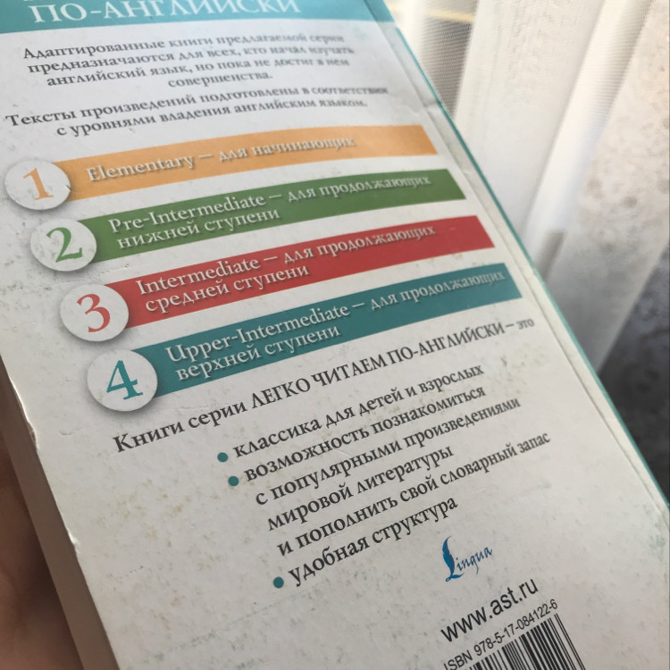 Слишком крупный шрифт. Словарь англо-русский в конце книги есть. 4-й уровень скорей для Intermediate, но не для upper. Для меня показался легким, качество хорошее.