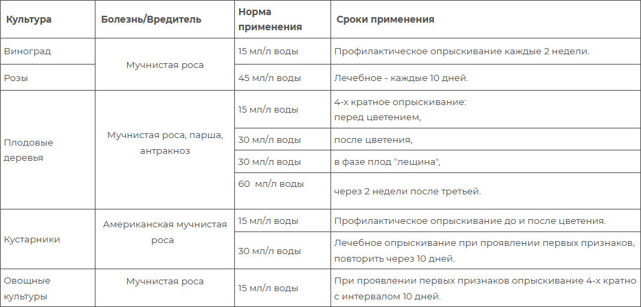 Способ применения: начинать обработку при первых признаках болезней. Опрыскивать растения, равномерно увлажняя поверхность листьев и коры. Обработку проводить в утренние или вечерние часы, в сухую безветренную погоду. Период защитного действия может длиться 7-10 дней. Обработка во время цветения растений не рекомендуется. Рабочий раствор использовать сразу после приготовления! Допускается образование естественного осадка.