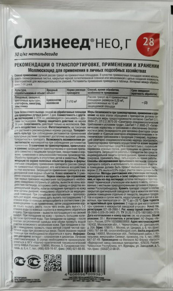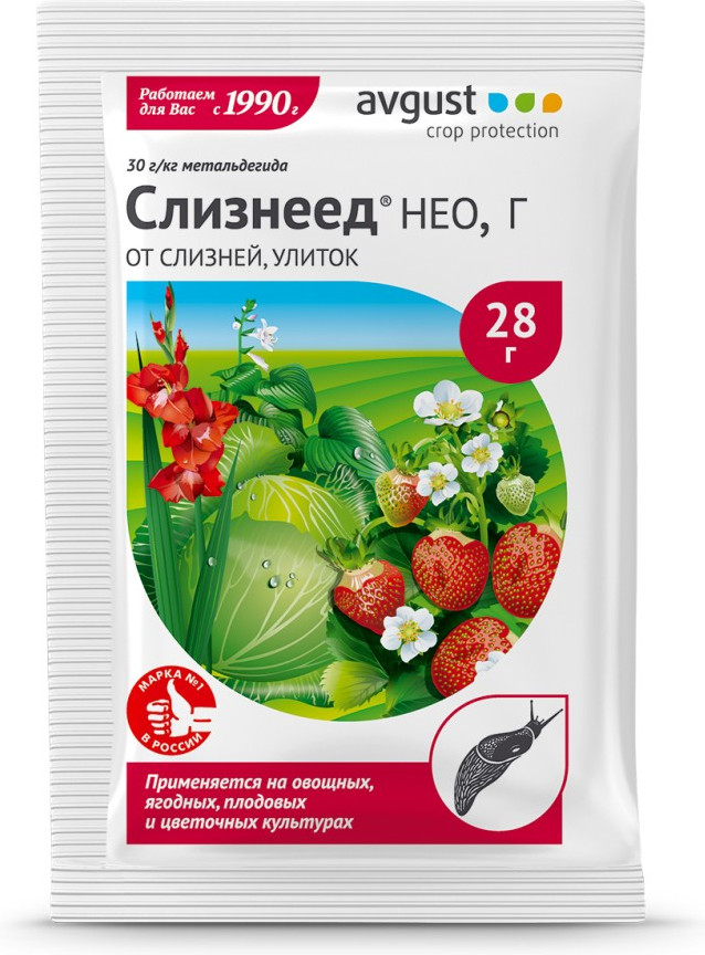 С нашествием слизняков и улиток сталкивался практически каждый владелец приусадебного участка. Одним из наиболее эффективных является «Слизнеед Нео». Препарат попадает в организм вредителей двумя способами: через кожные покровы после контакта с гранулами и непосредственно с пищей. «Слизнеед Нео» провоцирует обезвоживание организма слизняков и улиток, что приводит к их дальнейшей гибели. Средство можно купить для применения на овощных, плодовых, цитрусовых, ягодных, цветочно-декоративных культурах и винограде. Период защитного действия препарата составляет 14 дней.
