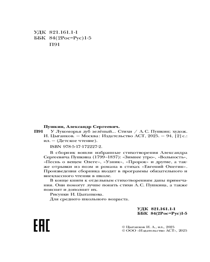 💳 Оплатить за товар можно при получении 🇰🇿 Есть бесплатная доставка по Казахстану от 1 дня 🎁 Копите бонусы с каждой покупки Серия: Детское чтение В сборник вошли избранные стихотворения Александра Сергеевича Пушкина (1799 —1837): «Зимнее утро», «Вольность», «Песнь о вещем Олеге», «Узник», «Пророк» и другие, а также отрывки из поэм и романа в стихах «Евгений Онегин». Произведения сборника входят в программы обязательного и внеклассного чтения в школе. |