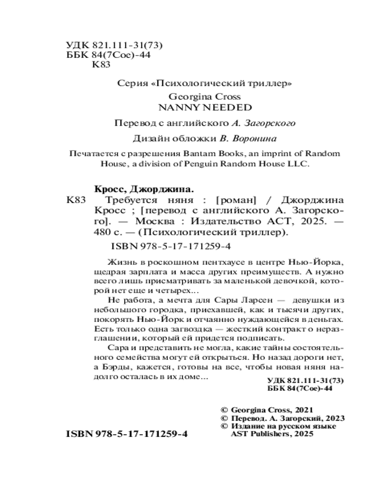 💳 Оплатить за товар можно при получении 🇰🇿 Есть бесплатная доставка по Казахстану от 1 дня 🎁 Копите бонусы с каждой покупки Серия: Психологический триллер (м) Жизнь в роскошном пентхаусе в центре Нью-Йорка, щедрая зарплата и масса других преимуществ. А нужно всего лишь присматривать за маленькой девочкой, которой нет еще и четырех... |