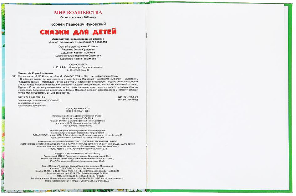 💳 Оплатить за товар можно при получении 🇰🇿 Есть бесплатная доставка по Казахстану от 1 дня 🎁 Копите бонусы с каждой покупки Серия: Мир волшебства Книга «К. И. Чуковский. Сказки для детей» из серии «Мир волшебства» ТМ «УМка» — отличный вариант для увлекательного чтения. Яркий сборник известных стихотворных сказок Корнея Ивановича Чуковского займёт достойное место в библиотеке вашего ребёнка. Красочные картинки и интересные тексты обязательно заинтересуют малыша. Рекомендовано детям старшего дошкольного возраста. |
