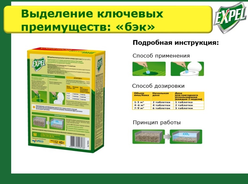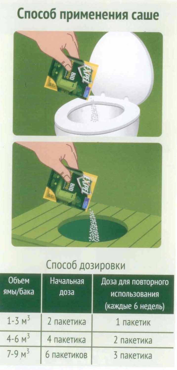 Для ямы с земляными стенками лучше сначала растворить в ведре воды, потом вылить в яму. Эффект от применения медленный, но явно положительный. Запах уходит на 100%. На мой взгляд важное условие это регулярное применение-первый год раз в 20 дней, второй и далее-раз в 1,5 месяца.