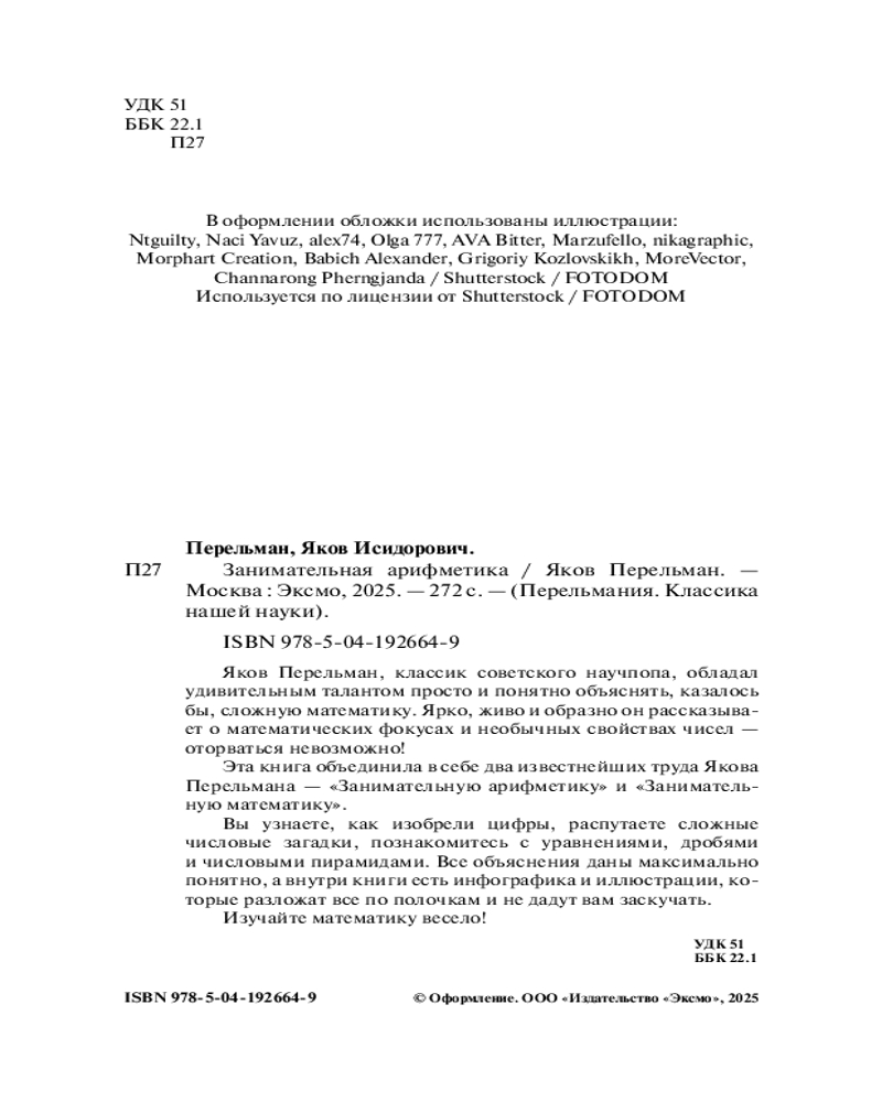 💳 Оплатить за товар можно при получении 🇰🇿 Есть бесплатная доставка по Казахстану 🎁 Копите бонусы с каждой покупки Серия: Перельмания. Классика нашей науки Яков Перельман, классик советского научпопа, обладал удивительным талантом: просто и понятно объяснять, казалось бы, сложную, но такую полезную в жизни математику. В этой книге мы объединили две книги Якова Перельмана — «Занимательную арифметику» и «Занимательную математику». Раскройте секреты фокусов с числами, узнайте, как изобрели цифры, раскройте хитроумные математические тайны. Изучайте математику весело! |