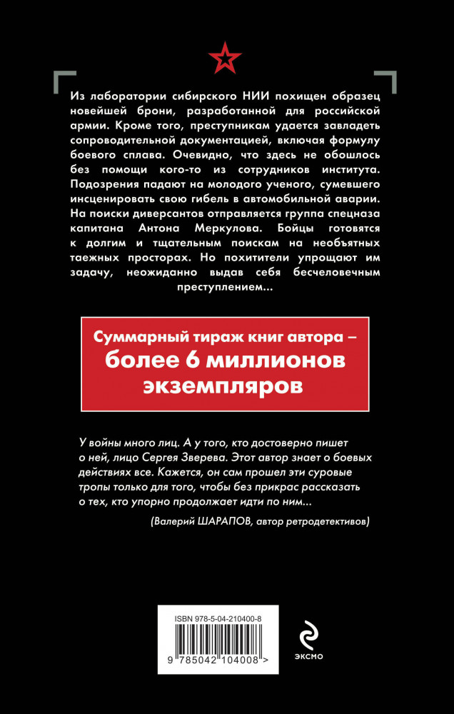 Боевой сплавВ данный момент этот товар отсутствует в продаже. Возможно, у нас найдется аналогичный или похожий товар здесь. Серия: Спецназ ГРУ. Боевые романы Сергея Зверева Из лаборатории сибирского НИИ похищен образец новейшей брони, разработанной для российской армии. Кроме того, преступникам удается завладеть сопроводительной документацией, включая формулу боевого сплава. Очевидно, что здесь не обошлось без помощи кого-то из сотрудников института. Подозрения падают на молодого ученого, сумевшего инсценировать свою гибель в автомобильной аварии. На поиски диверсантов отправляется группа спецназа капитана Антона Меркулова. Бойцы готовятся к долгим и тщательным поискам на необъятных таежных просторах. Но похитители упрощают им задачу, неожиданно выдав себя бесчеловечным преступлением... |