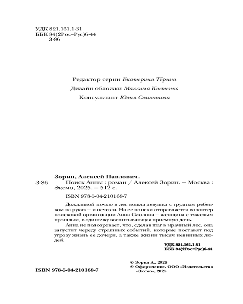 💳 Оплатить за товар можно при получении 🇰🇿 Есть бесплатная доставка по Казахстану от 1 дня 🎁 Копите бонусы с каждой покупки Серия: Выжить любой ценой. Психологический триллер Дождливой ночью в лес вошла девушка с грудным ребенком на руках — и исчезла. На ее поиски отправляется волонтер поисковой организации Анна Смолина — женщина с тяжелым прошлым, в одиночку воспитывающая приемную дочь. Анна не подозревает, что, сделав шаг в мрачный лес, она запустит череду страшных событий, которые поставят под угрозу жизнь ее дочери, а также жизни тысяч невинных людей. |
