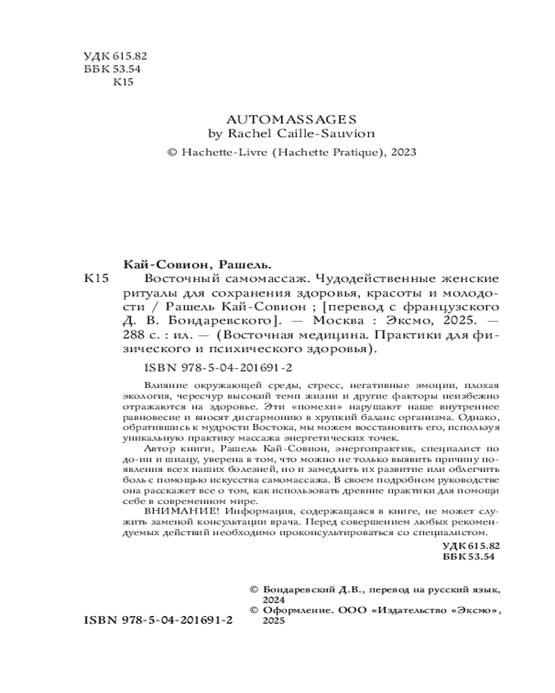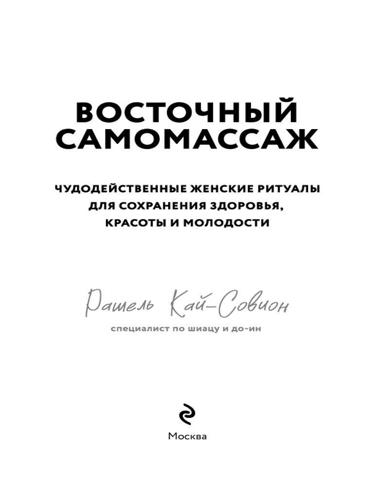Серия: Восточная медицина. Практики для физического и психического здоровья Зачем нужна книга о самомассаже, написанная специально для женщин? В своей уникальной книге специалист по шиацу и до-ин Рашель Кай объединила достижения и научные знания Запада с сакральными практиками Востока. Она создала самое полное руководство по самомассажу энергетических точек, где собрала более 50 техник, помогающих избавиться от различных проблем (головных болей, усталости, высокого давления, опущения органов малого таза и др.). Благодаря ее книге вы узнаете, как начать жить без болей, усталости, депрессии и чувствовать легкость в любом возрасте: |