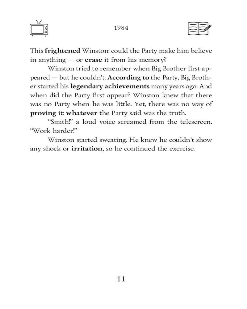 💳 Оплатить за товар можно при получении 🇰🇿 Есть бесплатная доставка по Казахстану от 1 дня 🎁 Копите бонусы с каждой покупки Серия: English Classics: Graded Readers «1984» — роман-антиутопия, написанный Джорджем Оруэллом, который изображает тоталитарное будущее, где государство полностью контролирует все аспекты жизни людей. Действие происходит в вымышленной стране Океания, где правящая партия во главе с Большим Братом использует жестокие методы подавления свободы, постоянного наблюдения и контроля за сознанием граждан. Главный герой, Уинстон Смит, работает в Министерстве Правды, где его обязанность — искажение исторических фактов в соответствии с пропагандой партии. Однако Уинстон начинает сомневаться в идеологии и порядке, в котором живет, и пытается восстать против системы. Роман исследует темы тоталитаризма, пропаганды, контроля над сознанием, манипуляции историей и языком, а также потери индивидуальной свободы. «1984» предупреждает об опасности авторитарных режимов и показывает, как власть может уничтожать не только свободу действий, но и способность людей мыслить самостоятельно. Текст романа адаптирован под уровень A2 и снабжен глоссарием. Также в книге есть упражнения для проверки своих знаний и понимания прочитанного. |