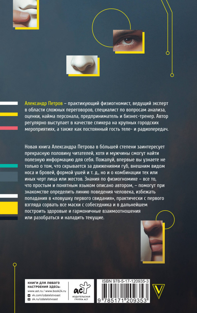 💳 Оплатить за товар можно при получении 🇰🇿 Есть бесплатная доставка по Казахстану 🎁 Копите бонусы с каждой покупки Серия: Практический тренинг Новая книга Александра Петрова по физиогномике в большей степени заинтересует прекрасную половину читателей, хотя и мужчины смогут найти полезную информацию для себя. Пожалуй, впервые вы узнаете не только о том, что скрывается за движениями губ, внешним видом носа и бровей, формой ушей и т.д., а узнаете о комбинации тех или иных черт лица или жестов. Знания по физиогномике — все то, что простым и понятным языком описано автором — помогут при знакомстве определить линию поведения человека, избежать попадания в «ловушку первого свидания», практически с первого взгляда сорвать все маски с собеседника и в дальнейшем построить здоровые и гармоничные взаимоотношения или разобраться и наладить текущие. |