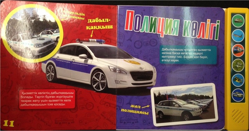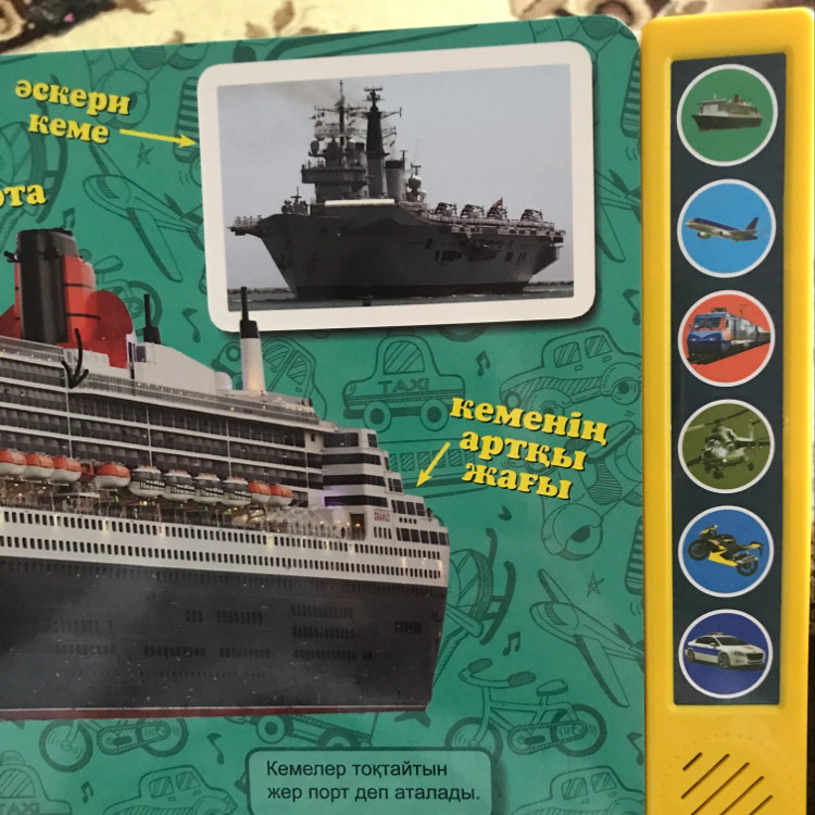 Жақсы кітап, сапалы, картоны қалың, суреттері иллюстрация емес, шынайы көліктердің суреті. Балама қатты ұнады. Дауысы шыққанда біраз шаңқылдап кетеді, сол үшін 4 жұлдыз.