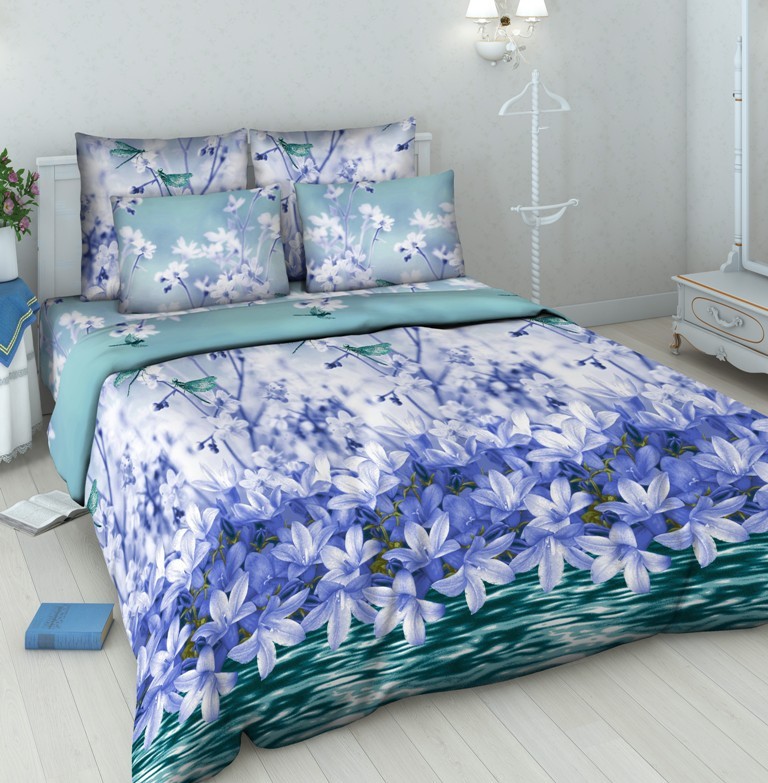 Белье хорошее, не линяет, вроде не село, но простынь маловата, на мою кровать 160х200, с высоким матрасом простынь совсем маленькая, не заправляется. Цвет отличается, совсем не такой как на картинке. Простынь и подушки темного голубого цвета, почти как цвет колокольчиков. Не совсем то, что ожидала, так как хотела белье именно такого цвета как на картинке.