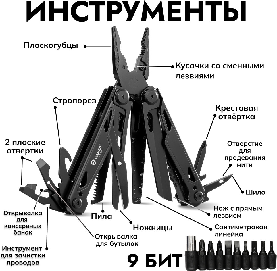 Универсальный мультитул Ganzo G303-B станет отличным инструментом на работе, дома, на отдыхе, в туристическом походе или во время экстренной ситуации. Если вам нужно что-то починить, смастерить, открыть или закрутить, то с помощью мультитула Ganzo вы несомненно отыщите нужный вам инструмент.
