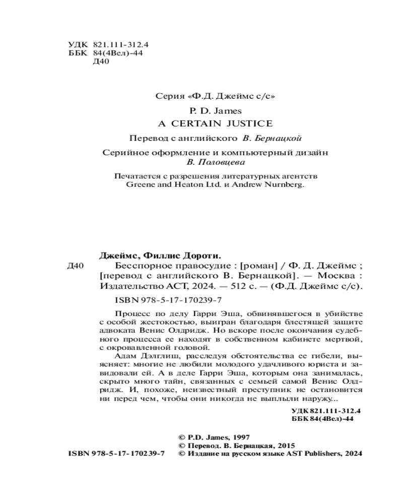 💳 Оплатить за товар можно при получении 🇰🇿 Есть бесплатная доставка по Казахстану 🎁 Копите бонусы с каждой покупки Серия: Ф.Д. Джеймс с/с Процесс по делу Гарри Эша, обвинявшегося в убийстве с особой жестокостью, выигран благодаря блестящей защите адвоката Венис Олдридж. Но вскоре после окончания судебного процесса ее находят в собственном кабинете мертвой, с окровавленной головой. |