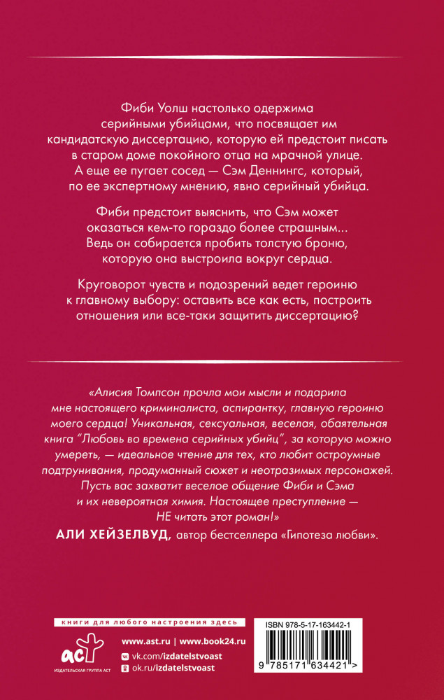 💳 Оплатить за товар можно при получении 🇰🇿 Есть бесплатная доставка по Казахстану от 1 дня 🎁 Копите бонусы с каждой покупки Серия: Ваниль и шоколад «Алисия Томпсон прочла мои мысли и подарила мне настоящего криминалиста, аспирантку, главную героиню моего сердца! Уникальная, сексуальная, веселая, обаятельная книга „Любовь во времена серийных убийц“, за которую можно умереть, — идеальное чтение для тех, кто любит остроумные подтрунивания, продуманный сюжет и неотразимых персонажей. Пусть вас захватит веселое общение Фиби и Сэма и их невероятная химия. Настоящее преступление — НЕ читать этот роман!» — Али Хейзелвуд, автор бестселлера «Гипотеза любви». |