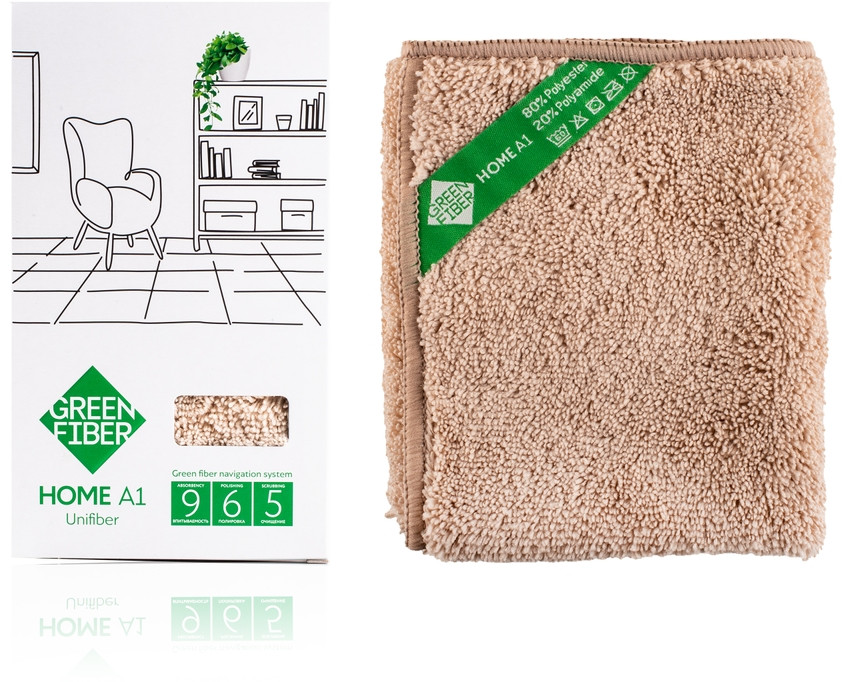 Файбер изготовлен из волокна уникального плетения UpPoly японской технологии. Во влажном состоянии оно создаёт капиллярный эффект, втягивая влагу и загрязнения, а в сухом — притягивает и удерживает пыль. Продукт экологичен, безопасен и не требует использования моющих средств. Оценка характеристик: впитываемость — 9/10, полировка — 6/10, очищение — 5/10. Файберы серии Green Fiber Home экономят деньги, время и усилия, а также имеют длительный срок эксплуатации до 2 лет при бытовом использовании. Рекомендуется использовать как во влажном, так и в сухом виде.