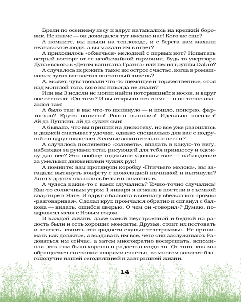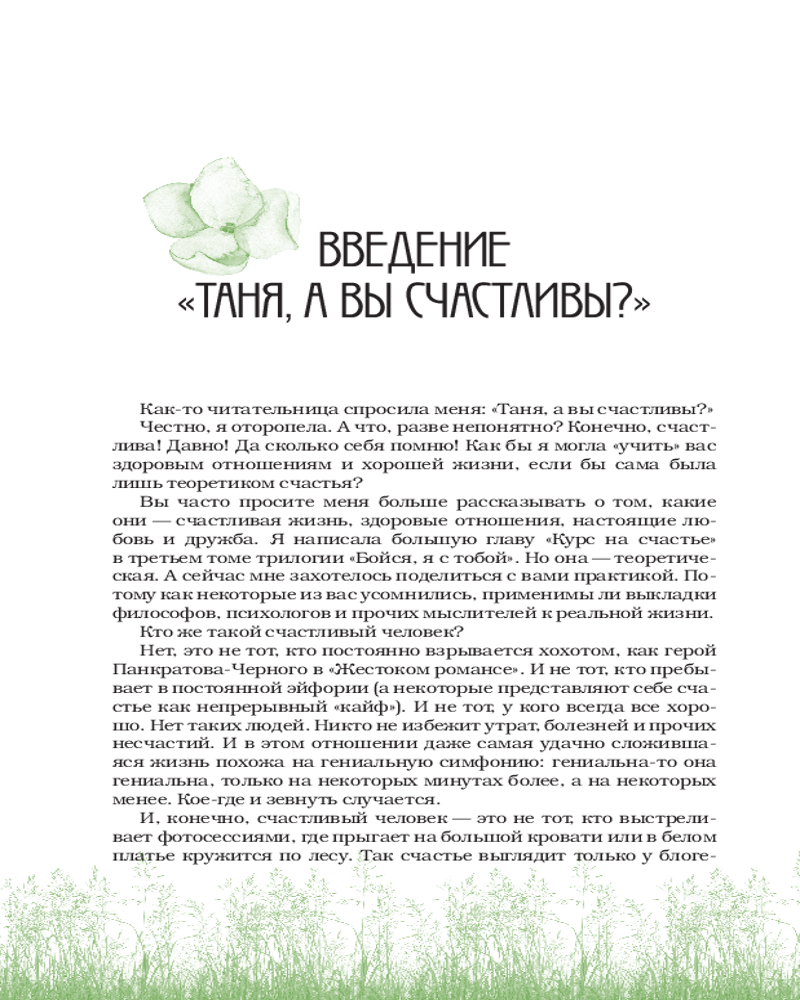 💳 Оплатить за товар можно при получении 🇰🇿 Есть бесплатная доставка по Казахстану от 1 дня 🎁 Копите бонусы с каждой покупки Серия: За кружкой какао Однажды читательница спросила меня: «Таня, а вы счастливы?» И я поняла, что пора рассказать вам, как я живу. Из этой книги вы узнаете обо мне много личного. Почему буква Я — первая в моем алфавите. Почему я схожусь с людьми по расчету. Почему тепло вспоминаю о подруге, с которой поссорилась 20 лет назад. Почему и кому я завидовала. Почему мои мечты почти всегда сбываются, а о несбывшихся я не грущу. И наконец, почему я считаю себя счастливой. |
