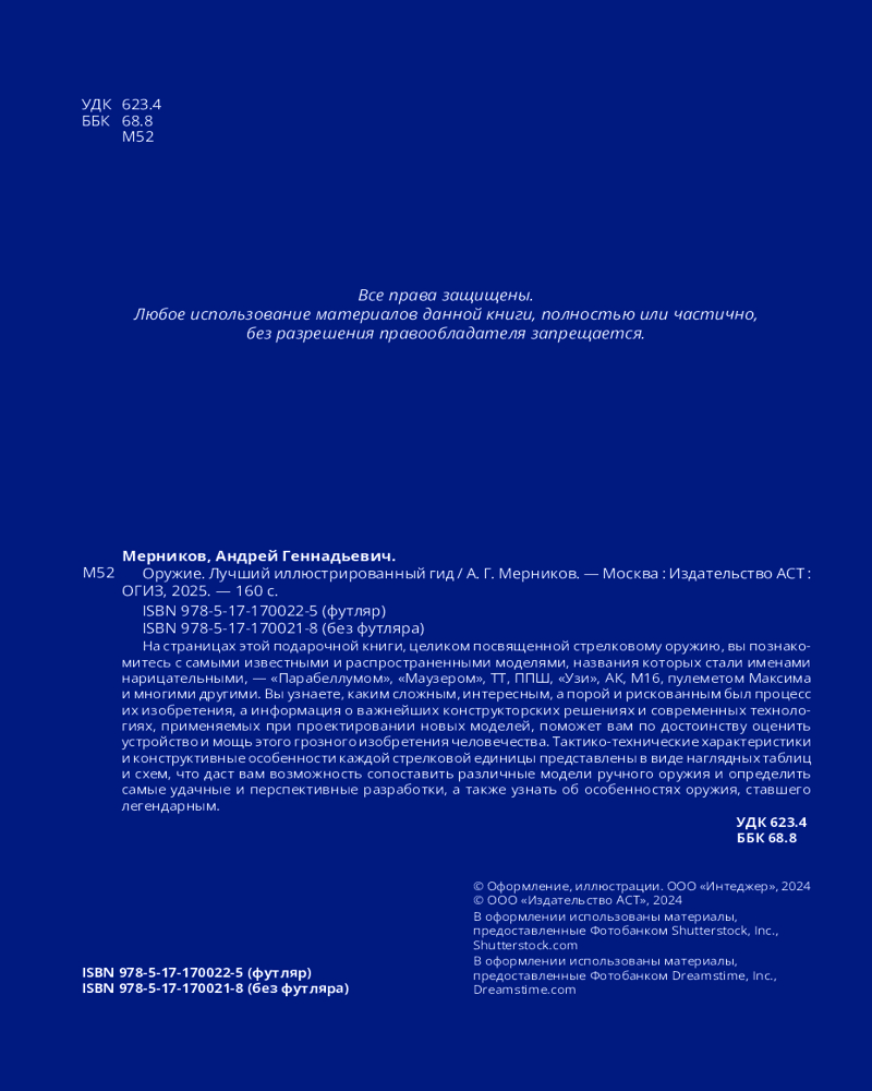 Оружие. Лучший иллюстрированный гидВ данный момент этот товар отсутствует в продаже. Возможно, у нас найдется аналогичный или похожий товар здесь. Серия: Большая подарочная книга (футляр) На страницах этого большого подарочного издания представлены различные модели стрелкового оружия, рассказывается история их создания и развития, подробно рассмотрены тактико-технические характеристики и конструктивные особенности каждой единицы. Множество иллюстраций позволяет не только внимательно рассмотреть тот или иной образец, но и понять принцип его действия. Издание познакомит вас с самыми известными моделями, включая «Парабеллум», «Маузер», ТТ, ППШ, «Узи», АК, М16, пулемет Максима и многие другие. Но как узнать, что скрывается за короткими наименованиями? Какое оружие обладает лучшим сочетанием эргономичности и убойной силы? Почему порой два похожих внешне пистолета получают диаметрально противоположные отзывы? Эти и другие тайны легендарного стрелкового оружия шаг за шагом откроются для вас на страницах книги, а информация в виде наглядных таблиц и схем поможет легко сориентироваться среди множества моделей пистолетов, пистолетов-пулеметов, винтовок, автоматов и пулеметов. Приглашаем вас совершить путешествие в мир стрелкового оружия, которое будет особенно увлекательным для тех, кого интересует история военного дела. |