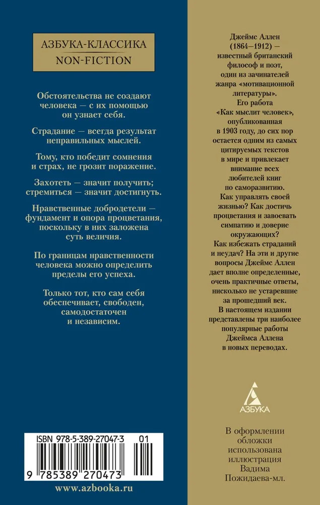 💳 Оплатить за товар можно при получении 🇰🇿 Есть бесплатная доставка по Казахстану от 1 дня 🎁 Копите бонусы с каждой покупки Серия: Азбука-Классика. Non-Fiction Джеймс Аллен (1864–1912) — известный британский философ и поэт, один из зачинателей жанра «мотивационной литературы». Его работа «Как мыслит человек», опубликованная в 1903 году, до сих пор остается одним из самых цитируемых текстов в мире и привлекает внимание всех любителей книг по саморазвитию. Как управлять своей жизнью? Как достичь процветания и завоевать симпатию и доверие окружающих? Как избежать страданий и неудач? На эти и другие вопросы Джеймс Аллен дает вполне определенные, очень практичные ответы, нисколько не устаревшие за прошедший век. В настоящем издании представлены три наиболее популярные работы Джеймса Аллена в новых переводах. |