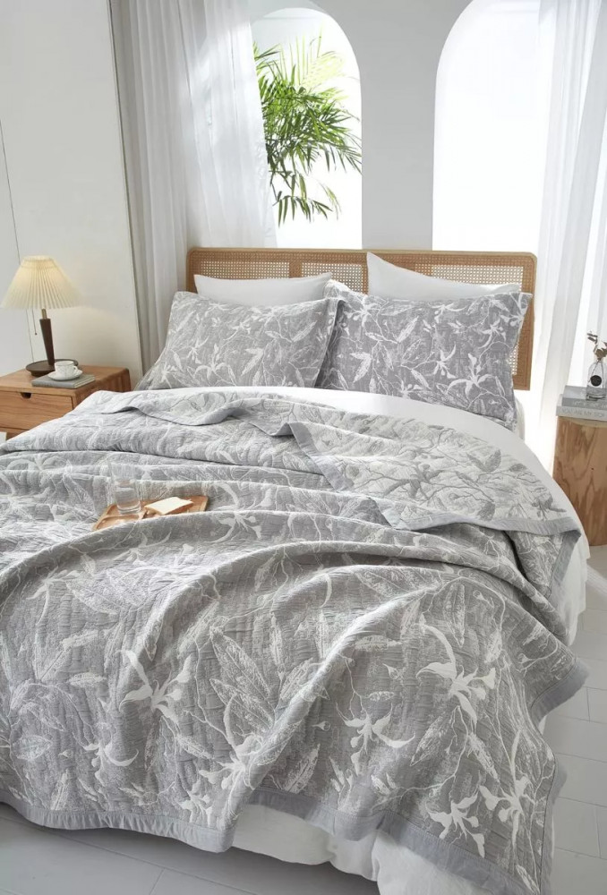 В меру тонкое, не тяжелое покрывало. Приятное на ощупь и очень хорошо прошито, швы аккуратные. В целом, как на фото (цвет, общий вид, рисунок).