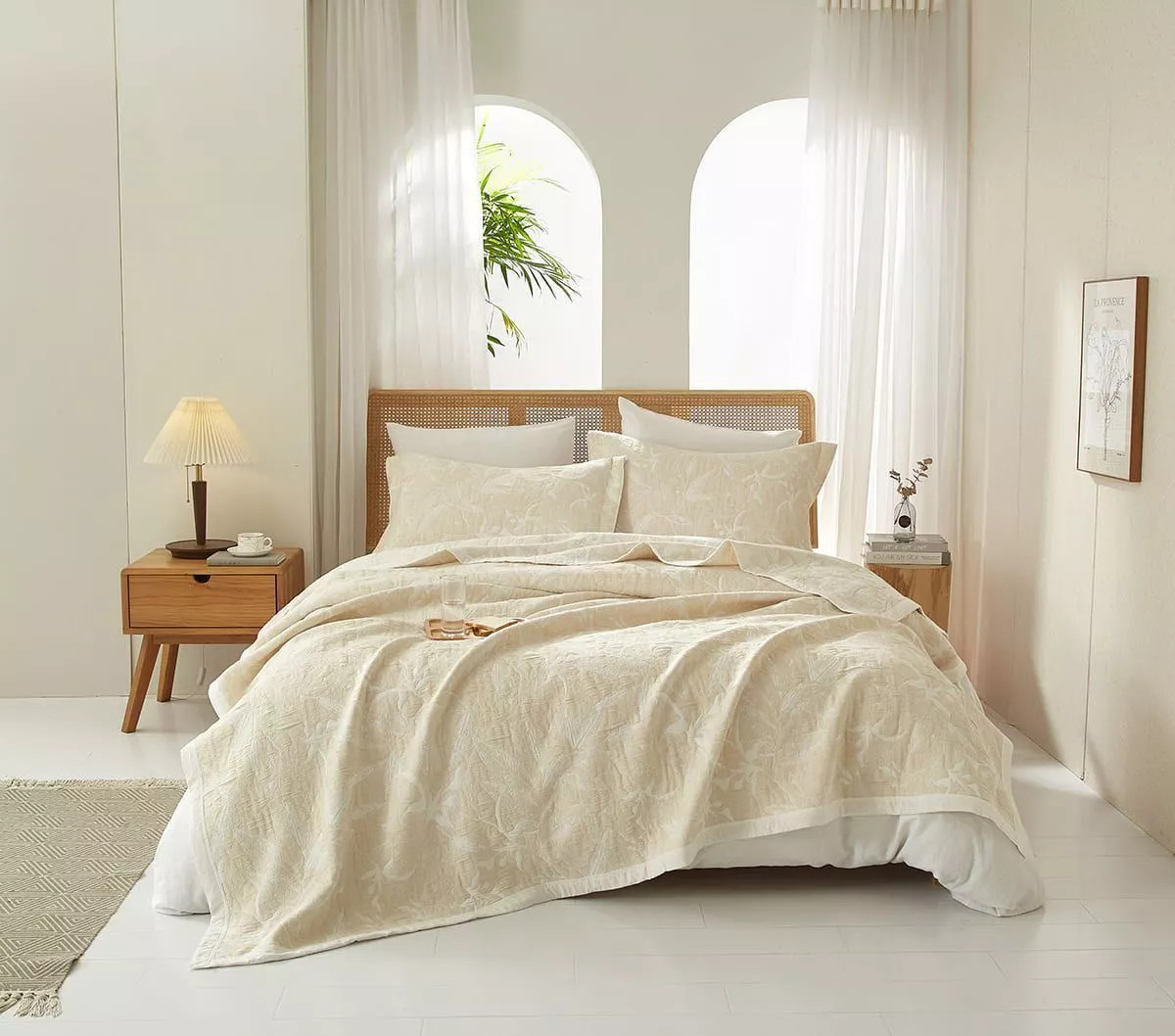 В меру тонкое, не тяжелое покрывало. Приятное на ощупь и очень хорошо прошито, швы аккуратные. В целом, как на фото (цвет, общий вид, рисунок).