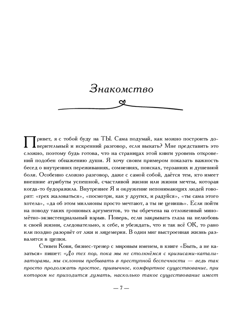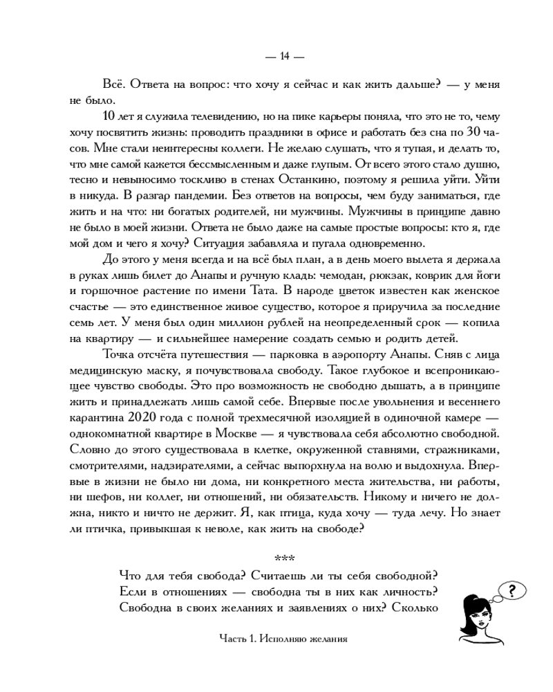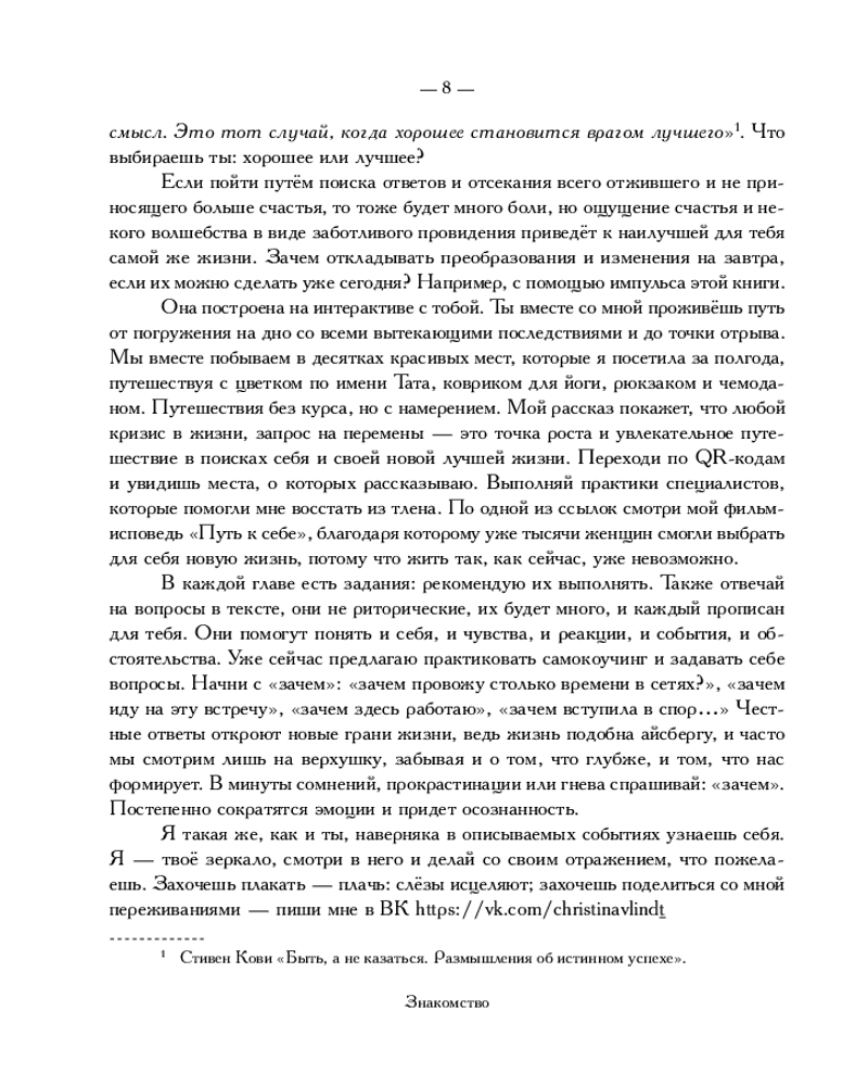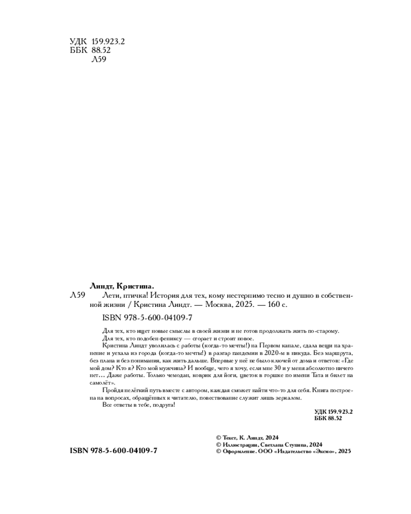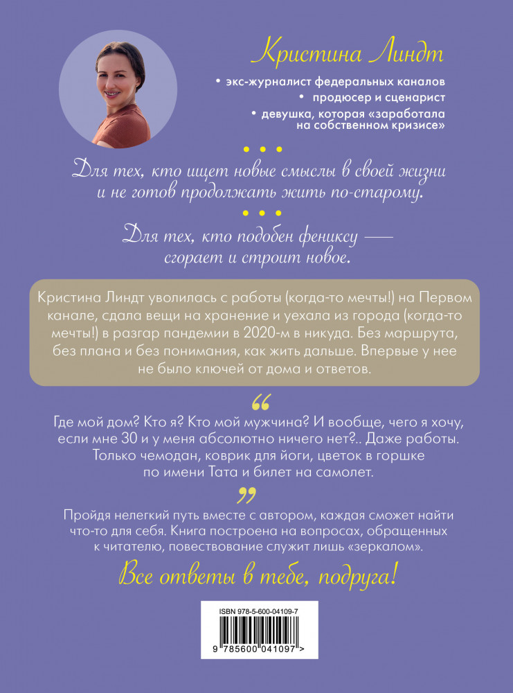 💳 Оплатить за товар можно при получении 🇰🇿 Есть бесплатная доставка по Казахстану 🎁 Копите бонусы с каждой покупки Серия: Говорят эксперты. Практичные книги от специалистов своего дела Для тех, кто ищет новые смыслы в своей жизни и не готов продолжать жить по-старому. Для тех, кто подобен фениксу — сгорает и строит новое. Кристина Линдт уволилась с работы (когда-то мечты!) на Первом канале, сдала вещи на хранение и уехала из города (когда-то мечты!) в разгар пандемии в 2020-м в никуда. Без маршрута, без плана и без понимания, как жить дальше. Впервые у нее не было ключей от дома и ответов: «Где мой дом? Кто я? Кто мой мужчина? И вообще, чего я хочу, если мне 30 и у меня абсолютно ничего нет... Даже работы. Только чемодан, коврик для йоги, цветок в горшке по имени Тата и билет на самолет». Пройдя нелегкий путь вместе с автором, каждая сможет найти что-то для себя. Книга построена на вопросах, обращенных к читателю, повествование служит лишь «зеркалом». Все ответы в тебе, подруга! |
