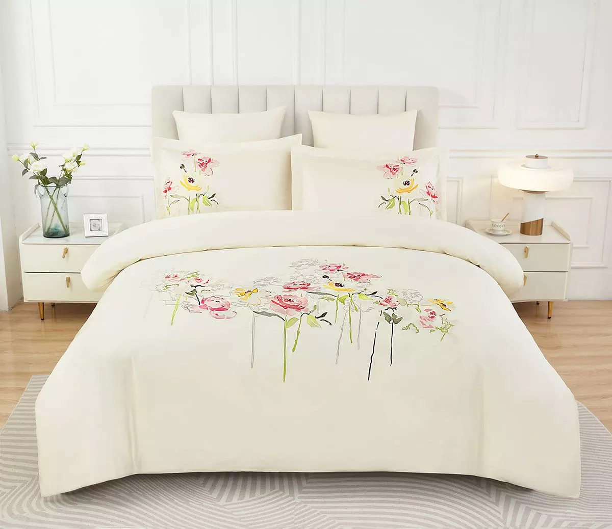 Комплект двуспального постельного белья из коллекции Elegant с изысканной вышивкой станет настоящей находкой для ценителей стиля и элегантности. Это красивое постельное белье изготовлено из высококачественного 100% хлопка. Плотность сатиновой ткани составляет 300 ТС, что обеспечивает надежность и долговечность изделия. Сатин обладает благородным шелковым блеском и невероятно мягкой текстурой, приятной на ощупь. Благодаря своим дышащим свойствам, натуральная хлопковая ткань поддерживает оптимальную температуру в любое время года, обеспечивая комфортный.
