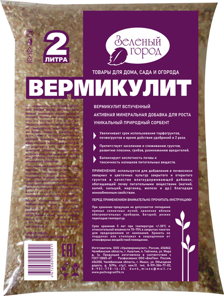 Зеленый город ВермикулитВ данный момент этот товар отсутствует в продаже. Возможно, у нас найдется аналогичный или похожий товар здесь. Вермикулит М 150 — природный минерал, используемый в качестве разрыхлителя почвы и влагоудерживающего компонента. Этот экологичный материал улучшает структуру грунта, делая его рассыпчатым и воздухопроницаемым, что способствует здоровому развитию корней растений. |