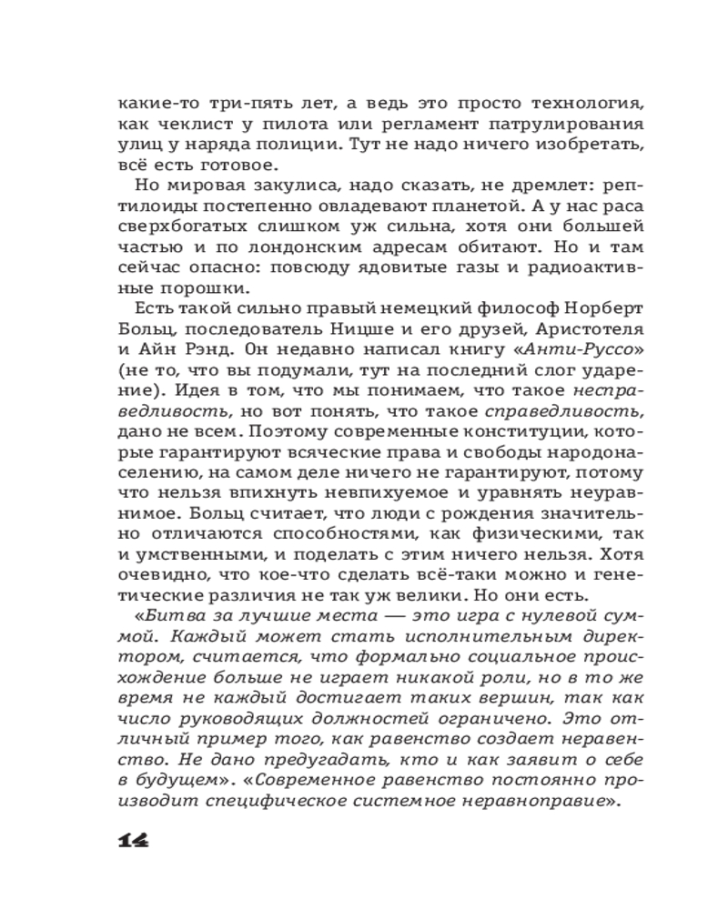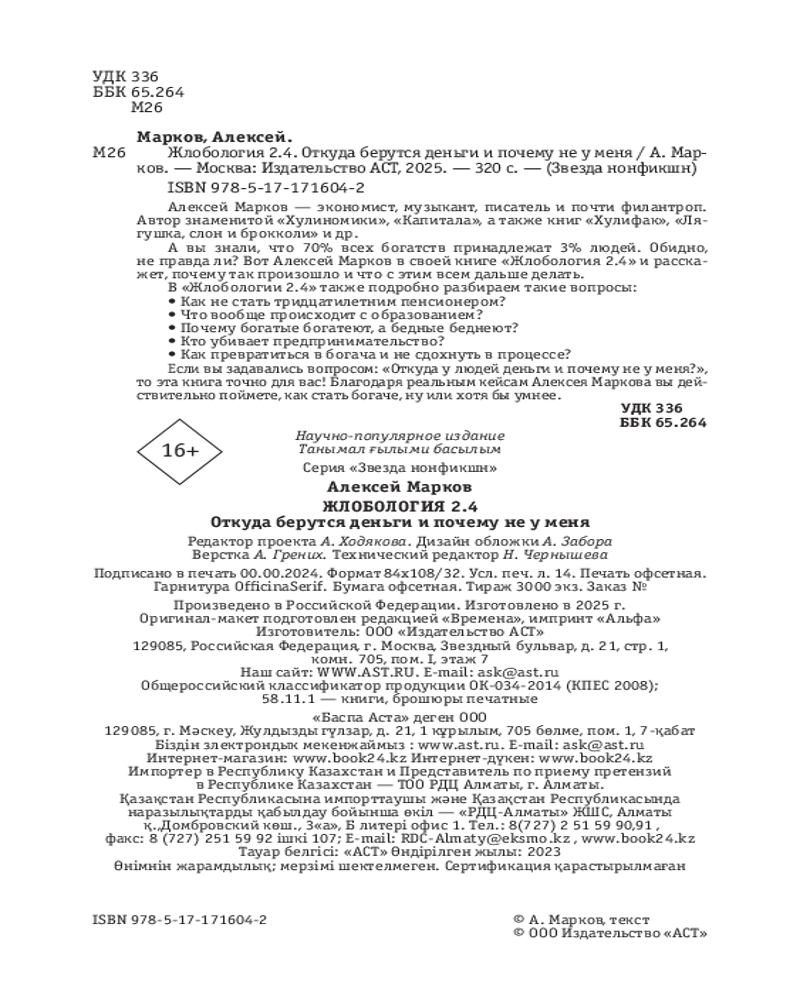 💳 Оплатить за товар можно при получении 🇰🇿 Есть бесплатная доставка по Казахстану 🎁 Копите бонусы с каждой покупки Серия: Звезда нонфикшн Алексей Марков — экономист, музыкант, писатель и почти филантроп. Автор знаменитой «Хулиномики», а также книг «Хулифак», «Лягушка, слон и брокколи» и др. Только представьте на секунду, что все богатства планеты будут принадлежать ничтожно малому количеству людей. Не представляйте. Оглянитесь. Так оно и есть — 70% всех богатств принадлежат 3% людей. Обидно, не правда ли? Вот Алексей Марков в своей книге «Жлобология 2.4» и расскажет, почему так произошло и что с этим всем дальше делать. |