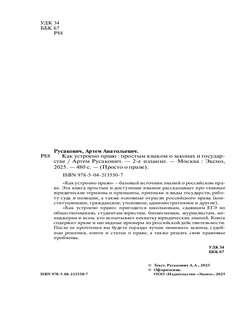 💳 Оплатить за товар можно при получении 🇰🇿 Есть бесплатная доставка по Казахстану 🎁 Копите бонусы с каждой покупки Серия: Просто о праве «Как устроено право» — базовый источник знаний о российском праве. Эта книга простым и доступным языком рассказывает про главные юридические термины и принципы, признаки и виды государств, работу суда и полиции, а также основные отрасли российского права (конституционное, гражданское, уголовное, административное и другие). |